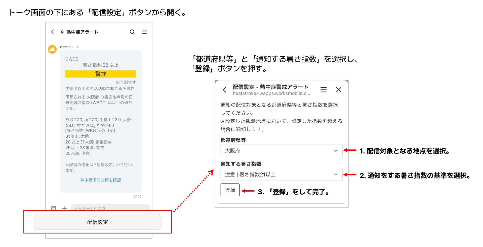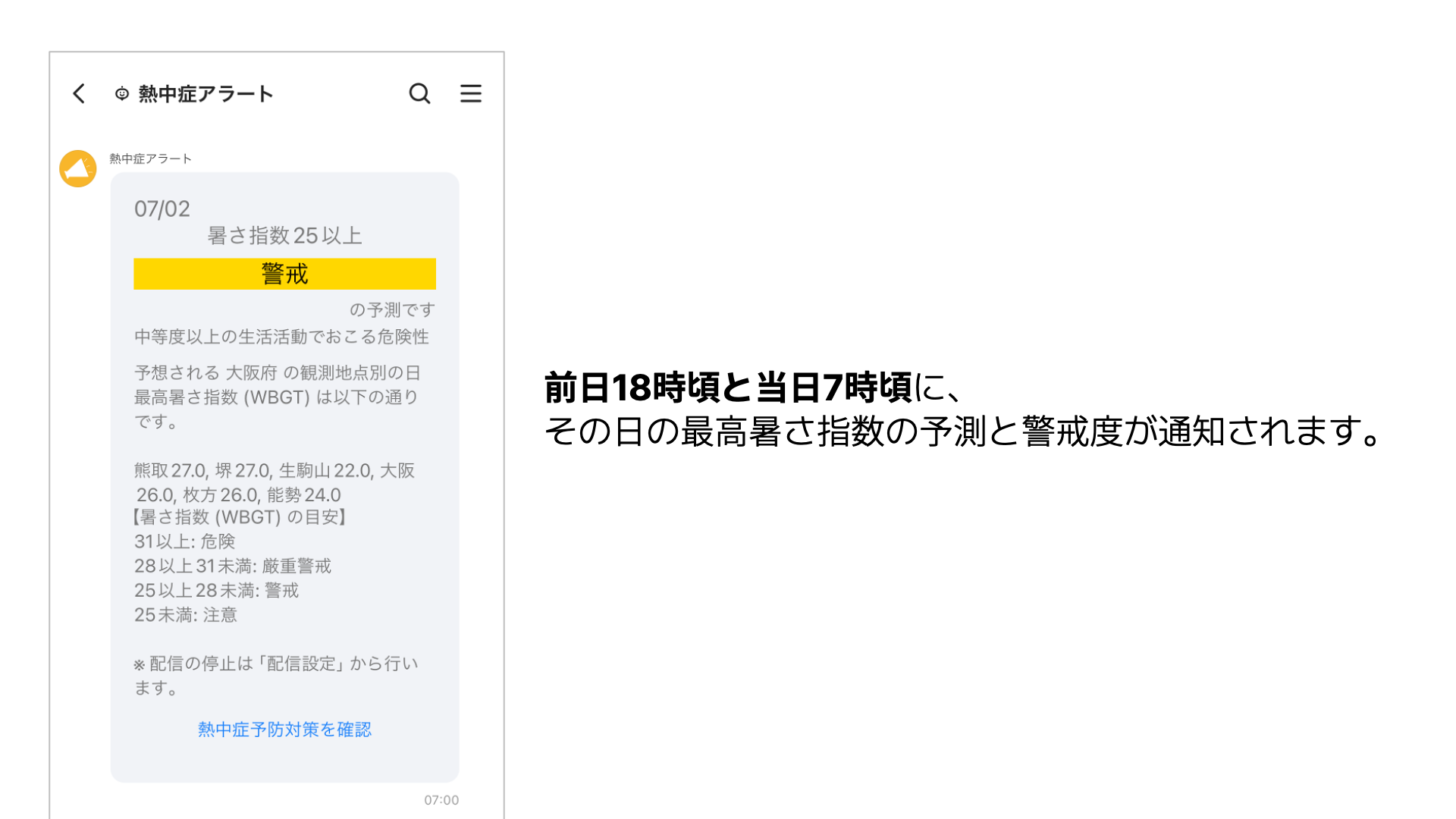 「熱中症アラート」アプリは、熱中症予防のための指標である「暑さ指数 (WBGT) 」と、その日の熱中症への警戒度をトークルームに配信します。