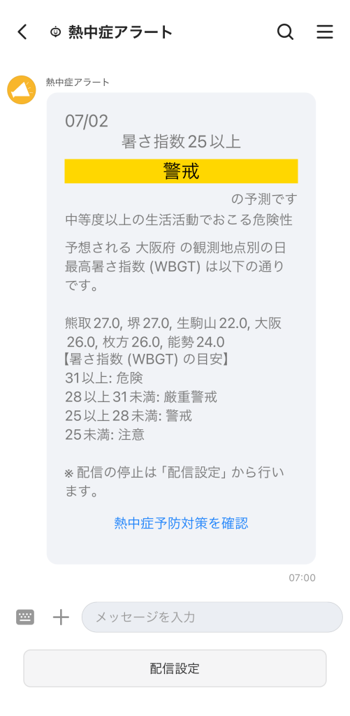 前日の夕方 (18時頃) と当日の朝 (7時頃) にその日の暑さ指数予測と警戒度がトークルームに配信されます。