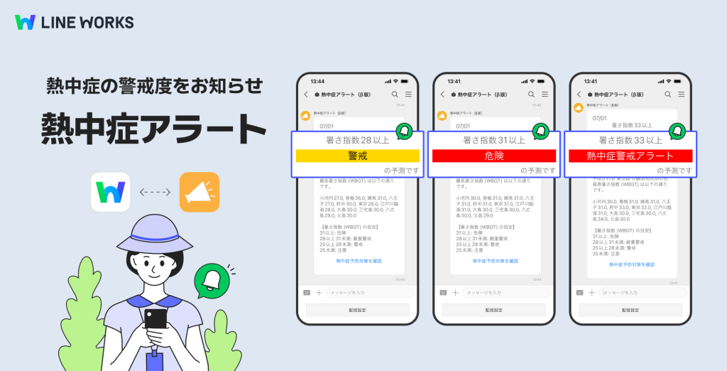 熱中症への警戒度を LINE WORKS 上に配信する「熱中症アラート」アプリが7月3日より提供開始いたしました。