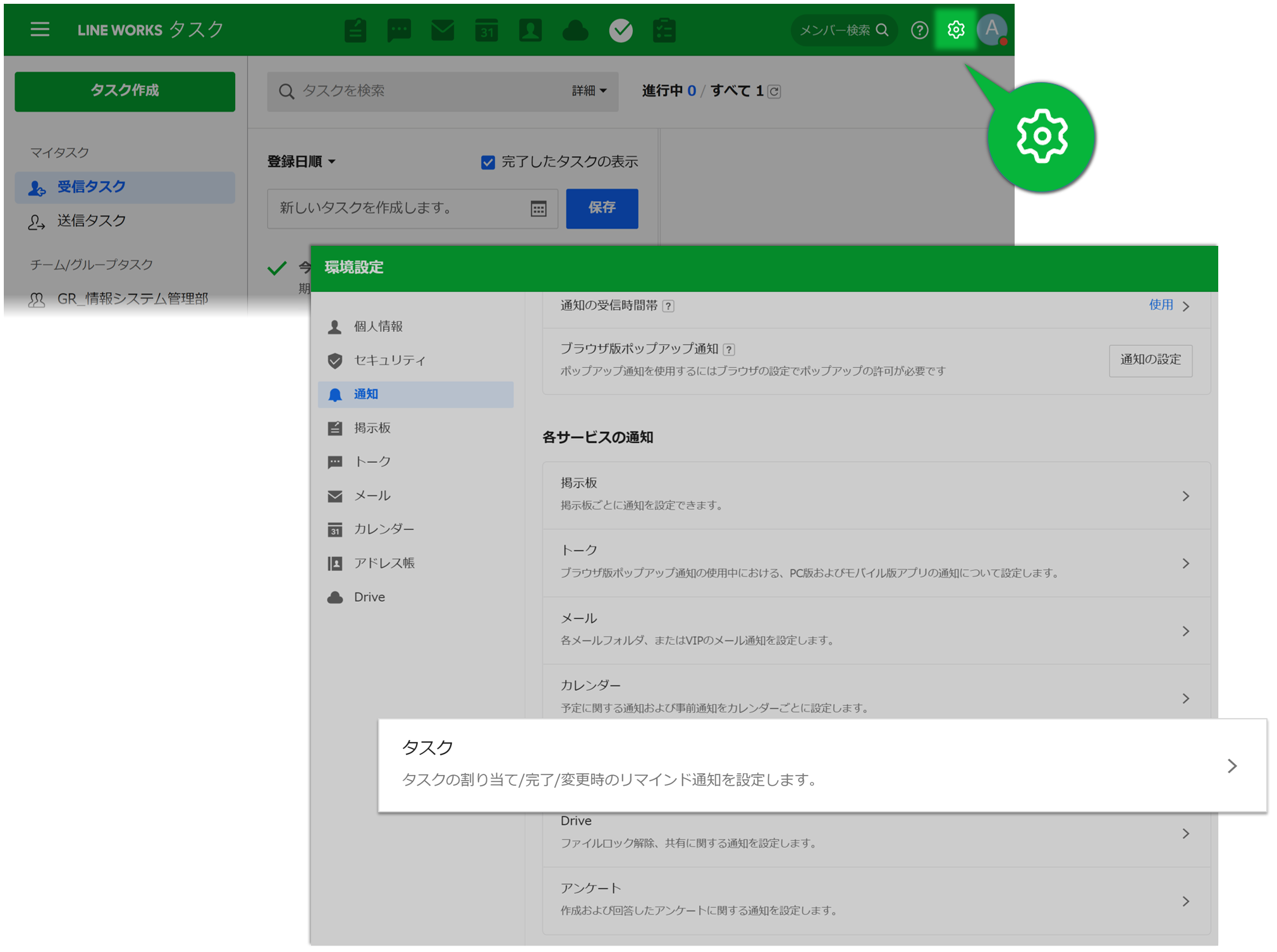タスク画面の上部右の歯車のアイコンをクリックし、環境設定に移動します。