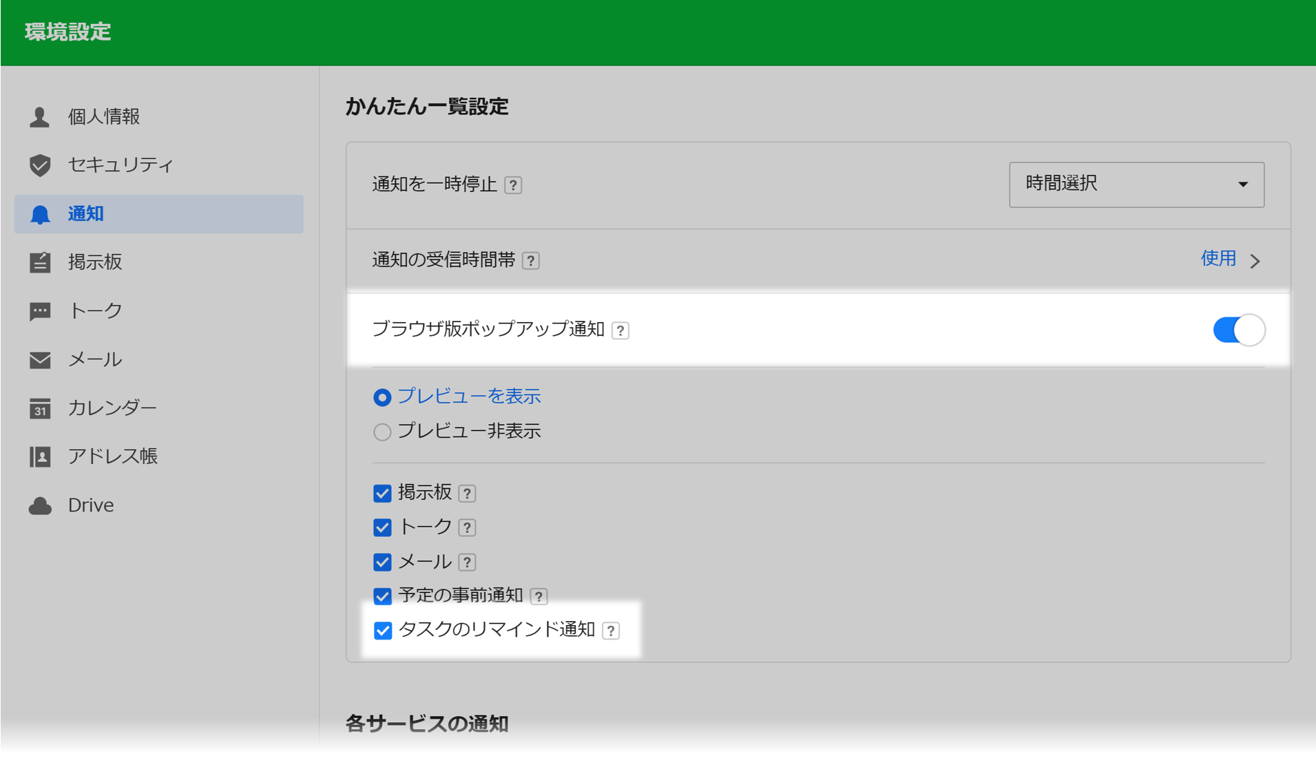 なお、ブラウザ版でポップアップ通知を受信する場合には、「通知」の項目の「ブラウザ版ポップアップ通知」でも設定が必要です。