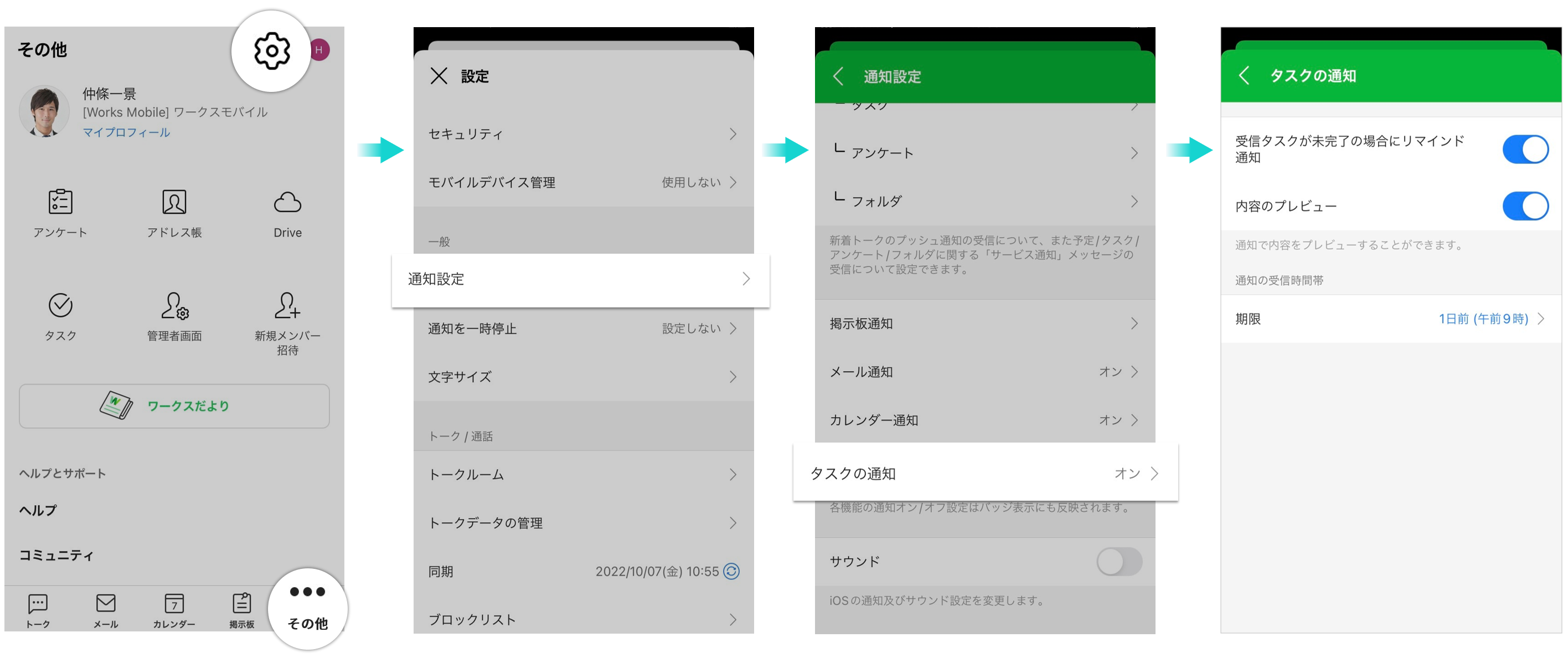 「一般」の項目にある「通知設定」から、「タスクの通知」をタップし、リマインドのプッシュ通知を設定します。