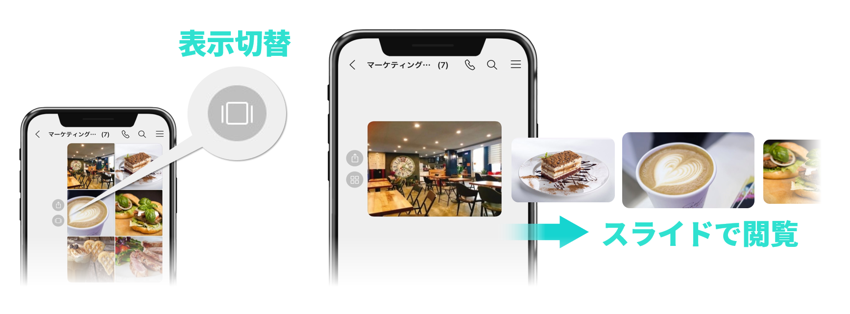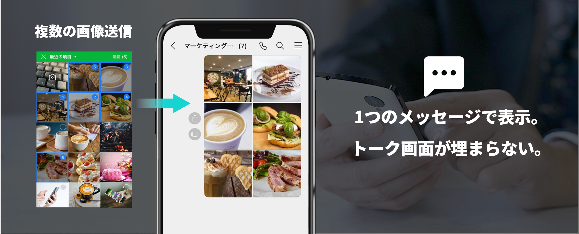 現場報告やデザイン候補の送信など、仕事では複数の画像を送信する機会も少なくありません。今回のアップデートでは、そんな場合にも1つのメッセージにまとめて画像が表示されるため、画像だけでトークルームが埋まってしまうストレスが解消されました。