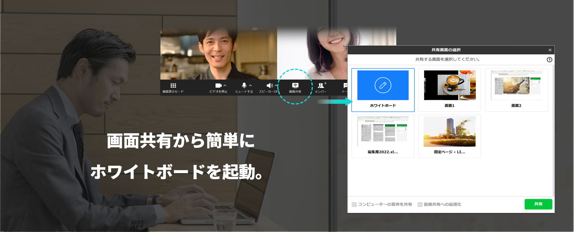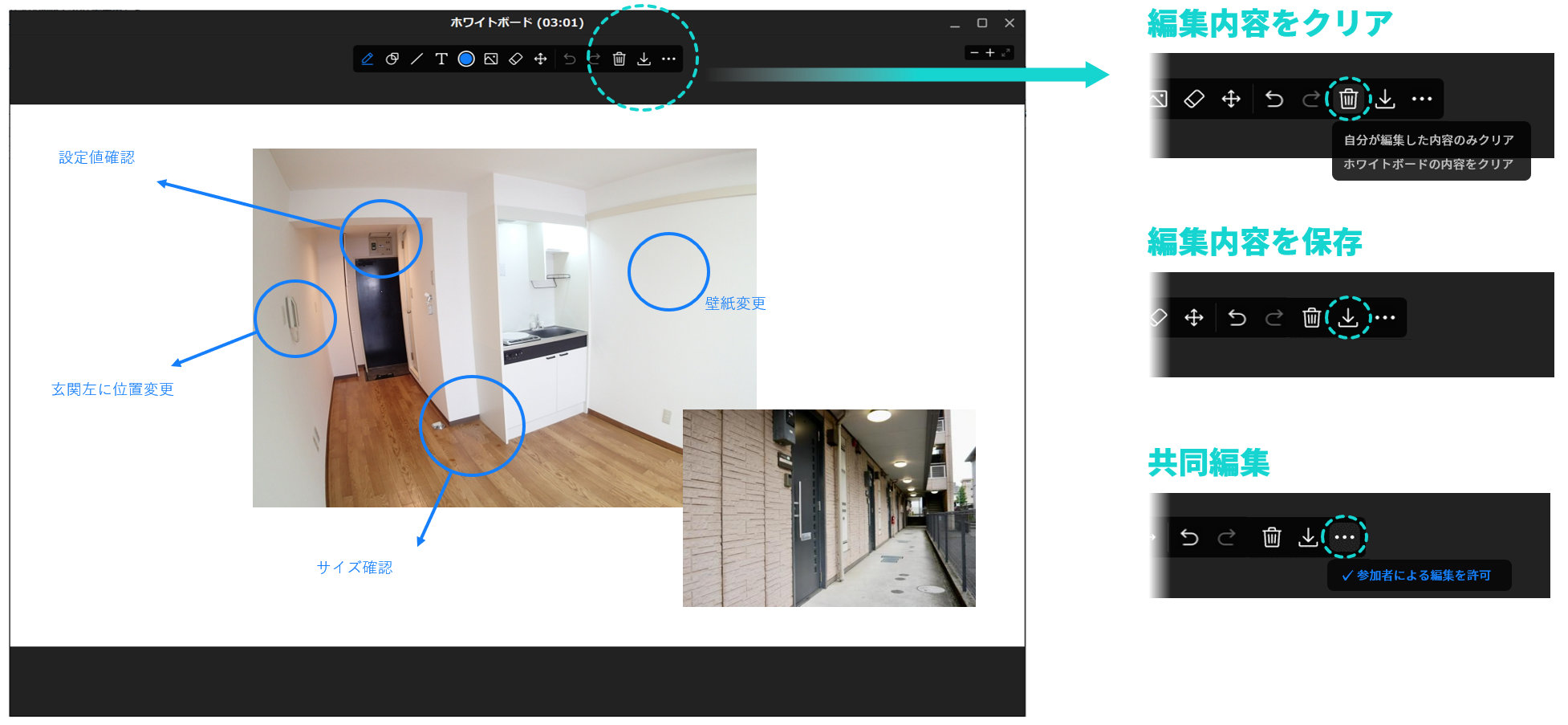 ホワイトボードの内容は画像として保存することもできるため、出し合ったアイデア等をミーティング後に再確認したり、参加できなかったメンバーに共有する場合にも便利です。