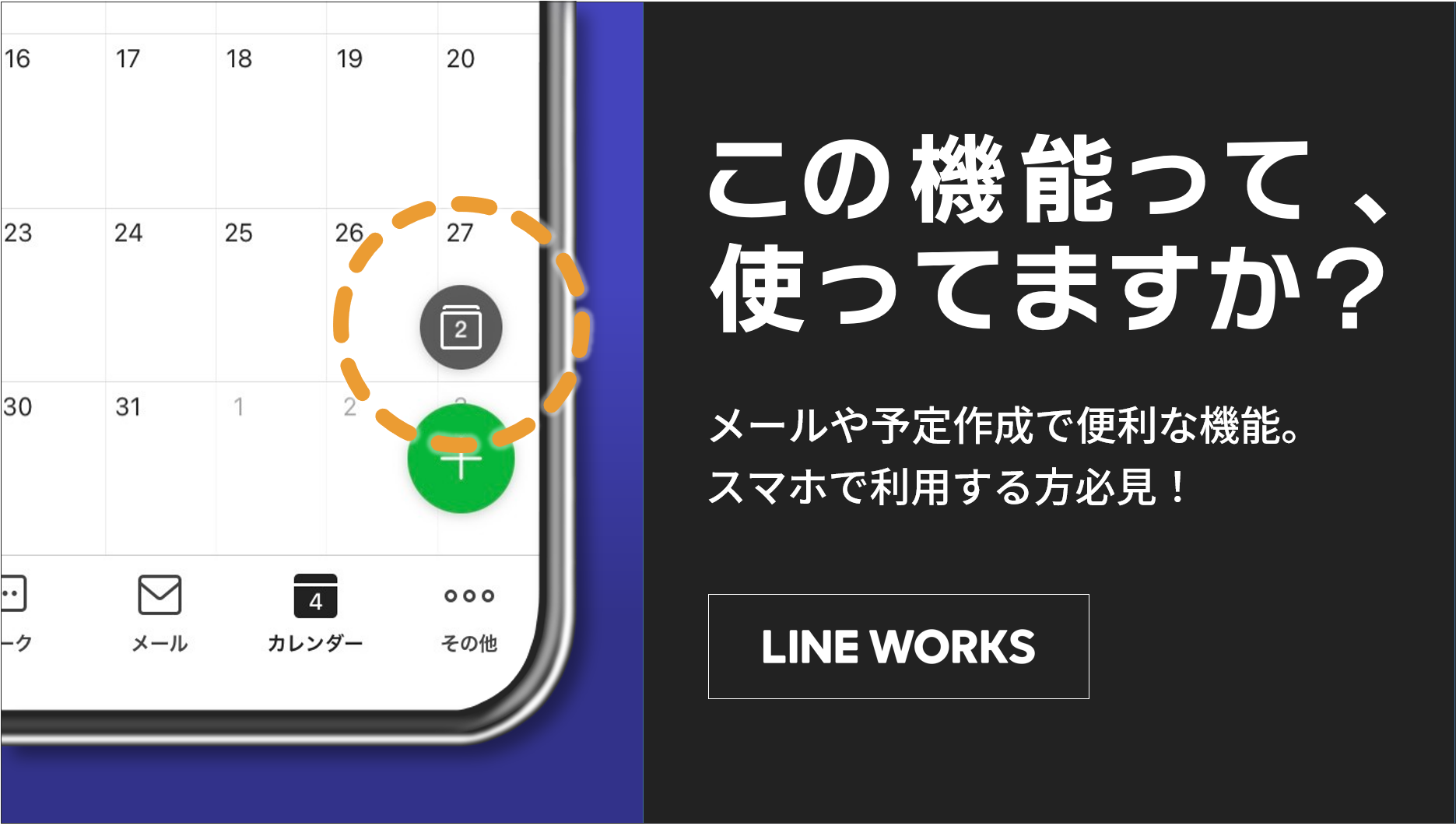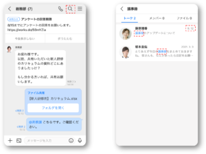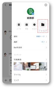 LINEのように、社内のメンバーを自由に招待してグループを作成できます。グループトークには、トーク以外にも情報共有のための機能が搭載されています。その一つが「グループフォルダ」です。