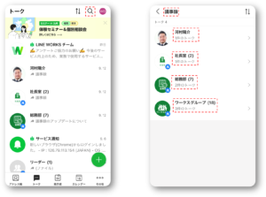 どこのトークルームでやりとりしたか分からない場合は、トークルーム一覧の右側にある虫眼鏡のアイコンから、すべてのトークルームを検索できます。
