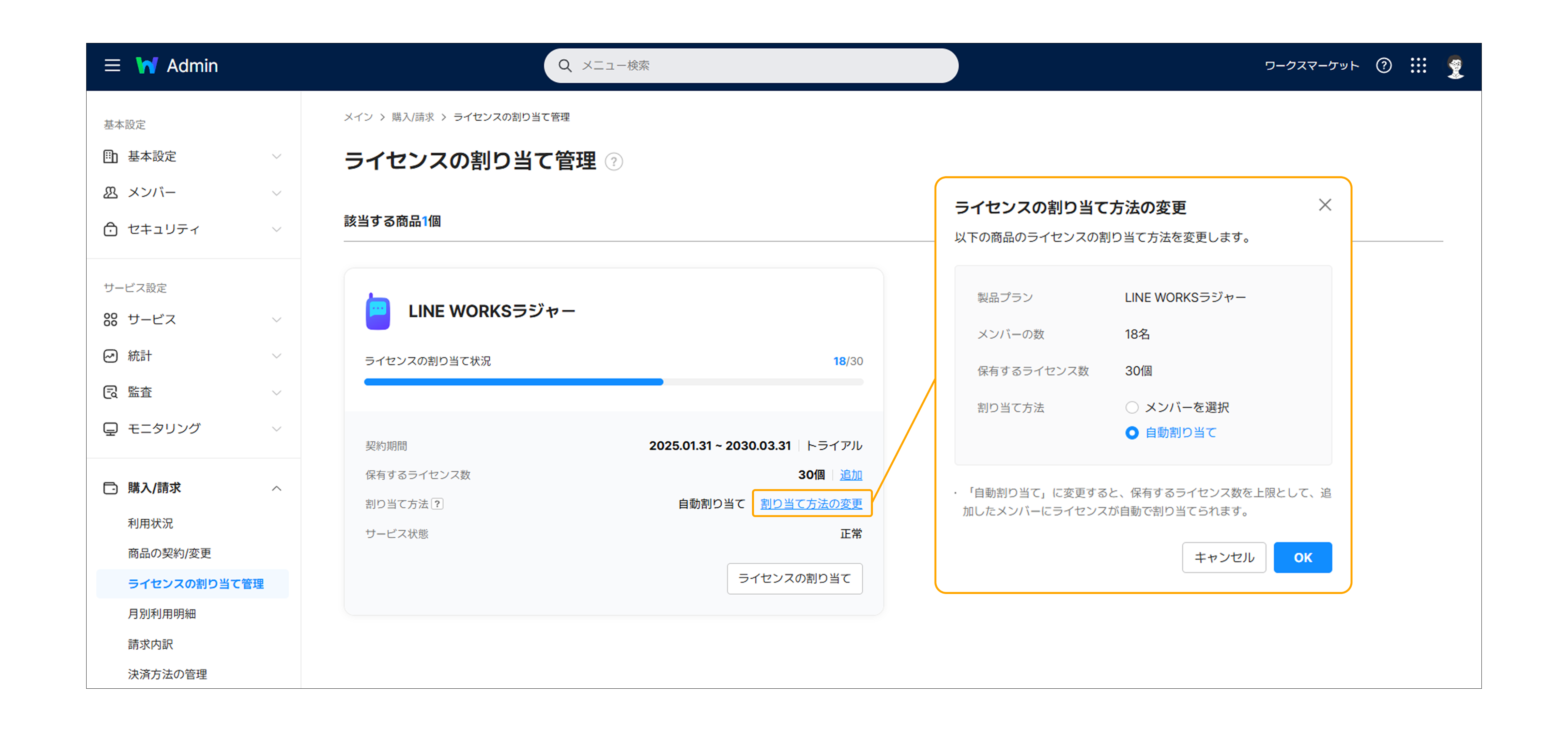 [購入/請求]>[ライセンスの割り当て管理]から「割り当ての方法の変更」が可能です。