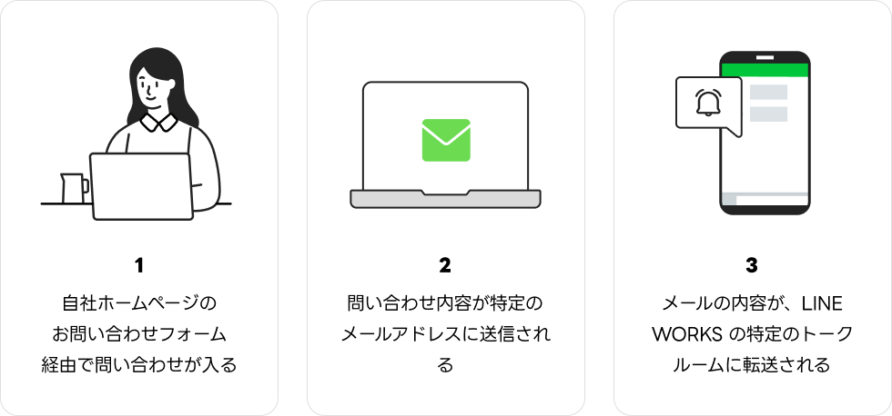 例えば、ウェブサイト経由でお問い合わせを受ける場合、以下のような流れでメールの内容が転送されます。