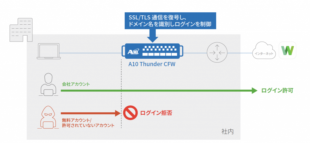 仕組みとしては、A10 Thunder CFW のがSSL/TLS 可視化(SSLインサイト)機能を用いて、LINE WORKS へログインする際のHTTPS通信を復号し、復号された通信に含まれるアカウント識別情報を検査します。アカウント情報のドメインが許可されていないドメインであればA10 Thunder CFWがそのアカウントでのログインを拒否します。