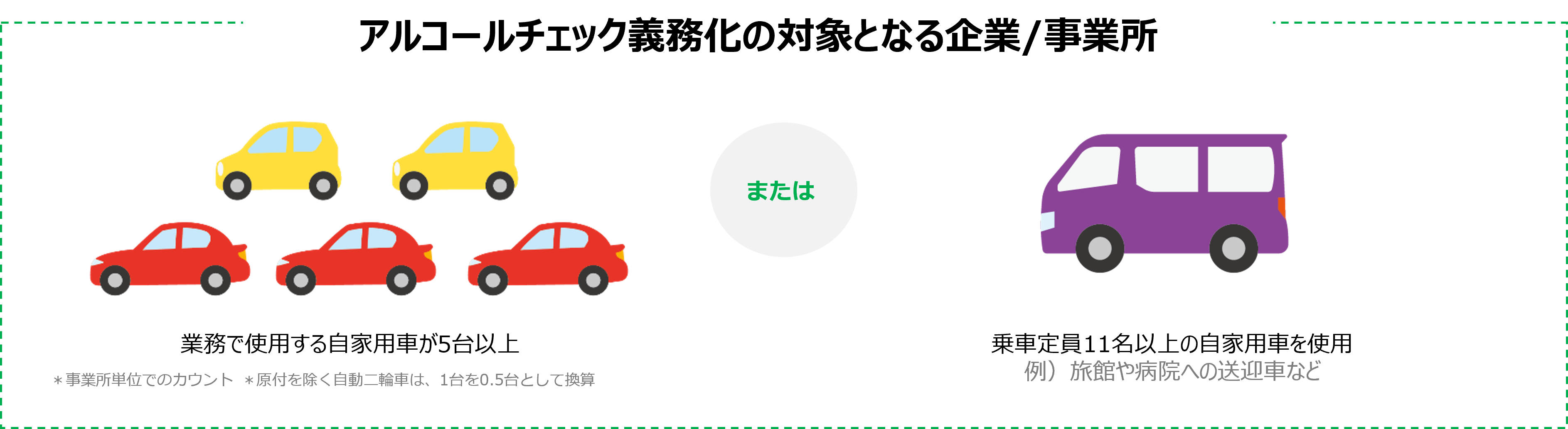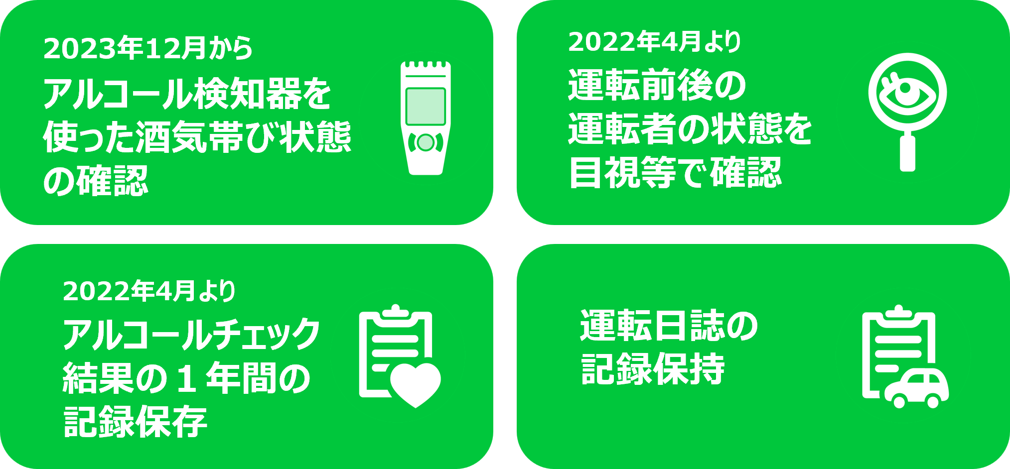 2022年4月に道路交通法改正により、白ナンバー車5台 または 乗車定員が11名以上の自動車1台以上保有する事業所に対して、アルコールチェックが義務化されました。