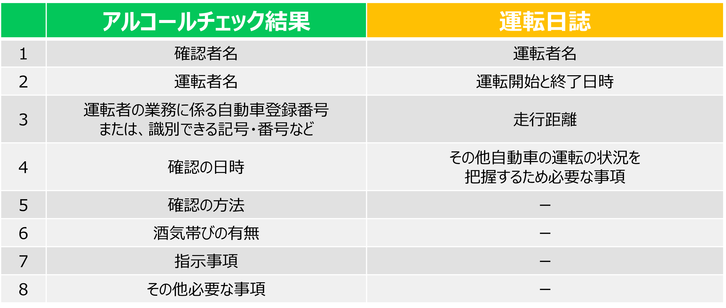 参考)アルコールチェック結果の記録項目と運転日誌の記録項目