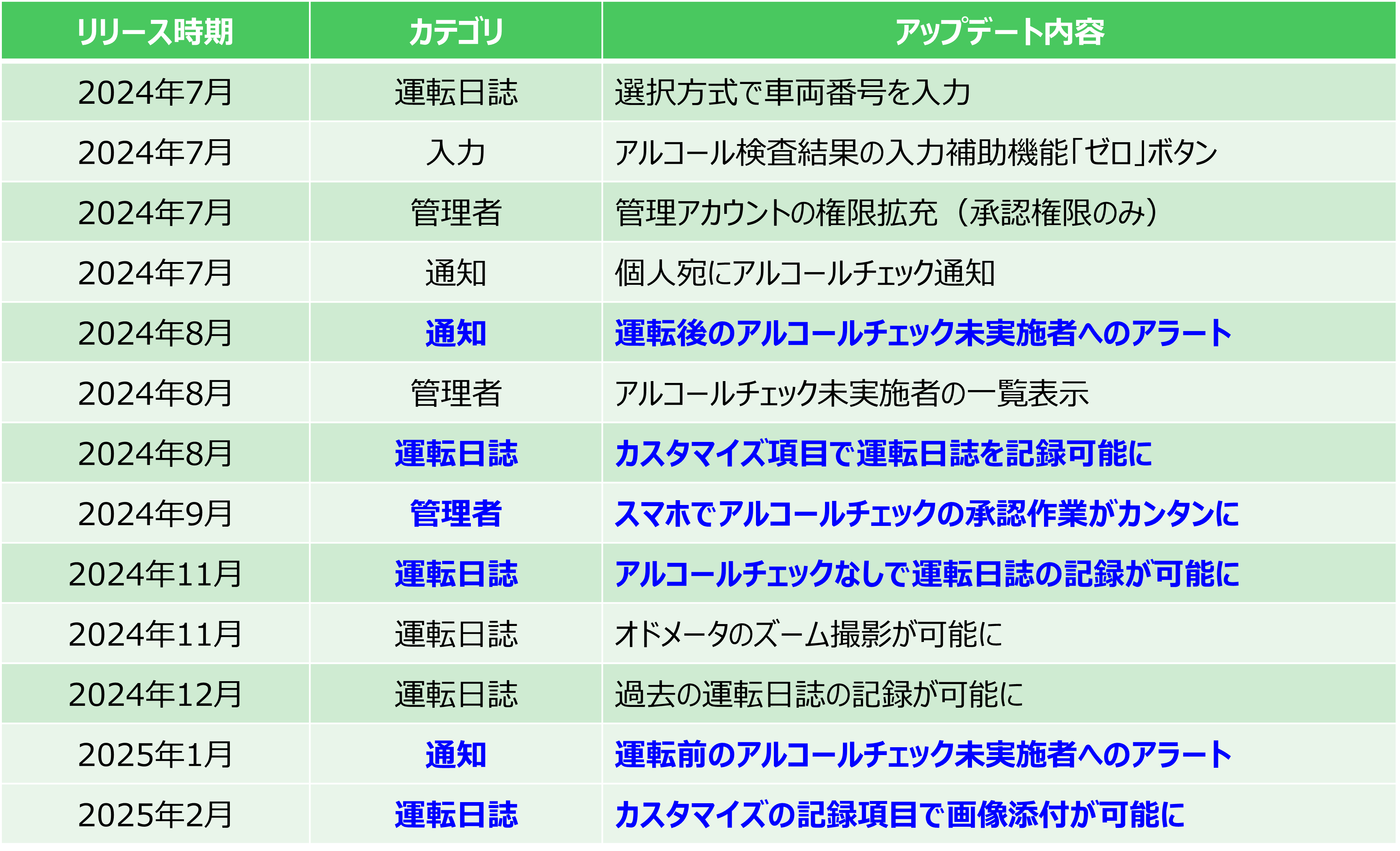 「アルろく for LINE WORKS」は、アルコールチェックや運転日誌の管理業務の課題を解決できるよう、お客様の声に耳を傾け、多くの機能アップデートを行っています。ご紹介したカスタマイズ機能や運転前・後のアルコールチェック未実施者へのアラート機能などは、お客様の声によって追加した機能です。