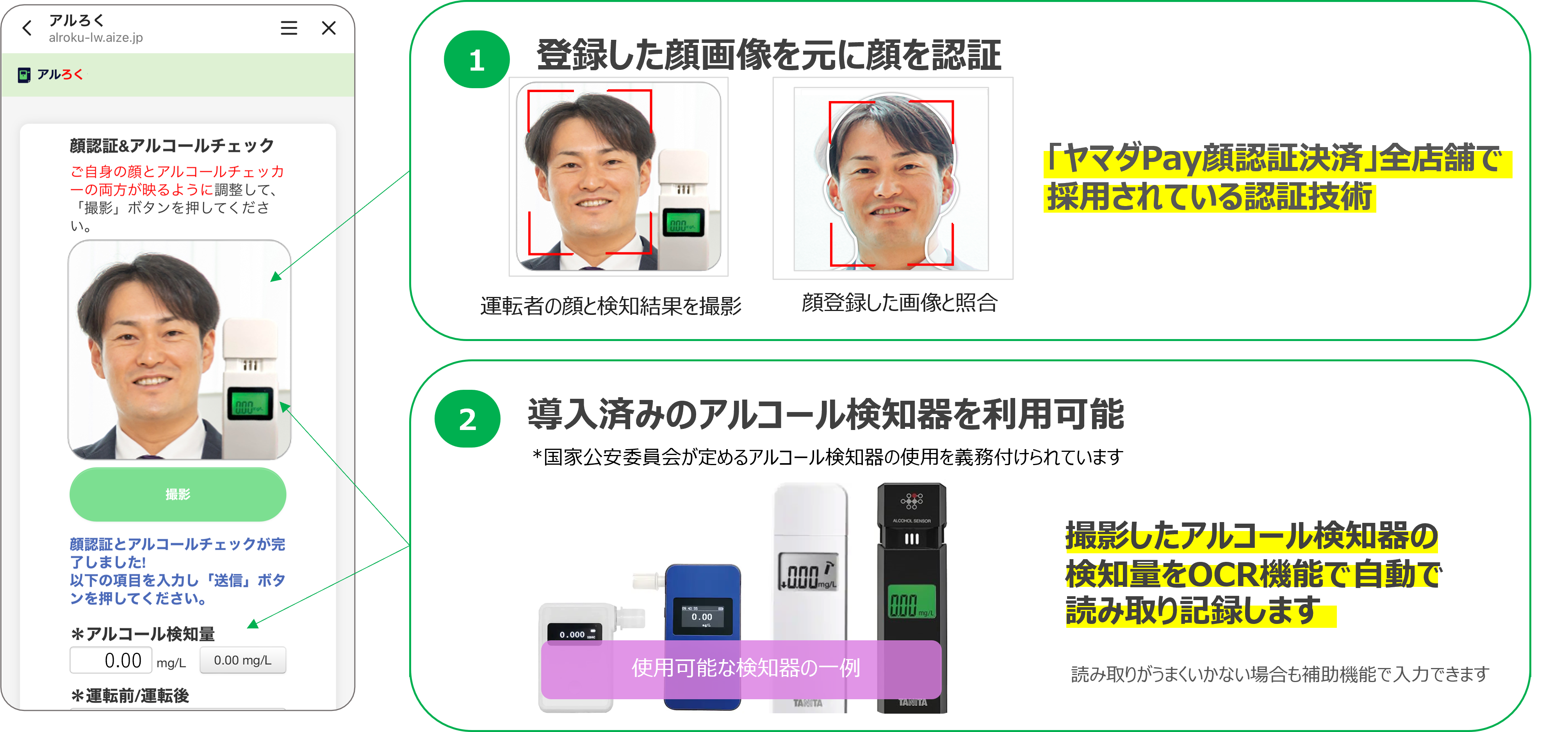 ドライバーの顔とアルコール検知器を一緒に撮影すると、AI顔認証による本人確認、OCRの技術で検知器に記載されている検知量を読み取り記録します。