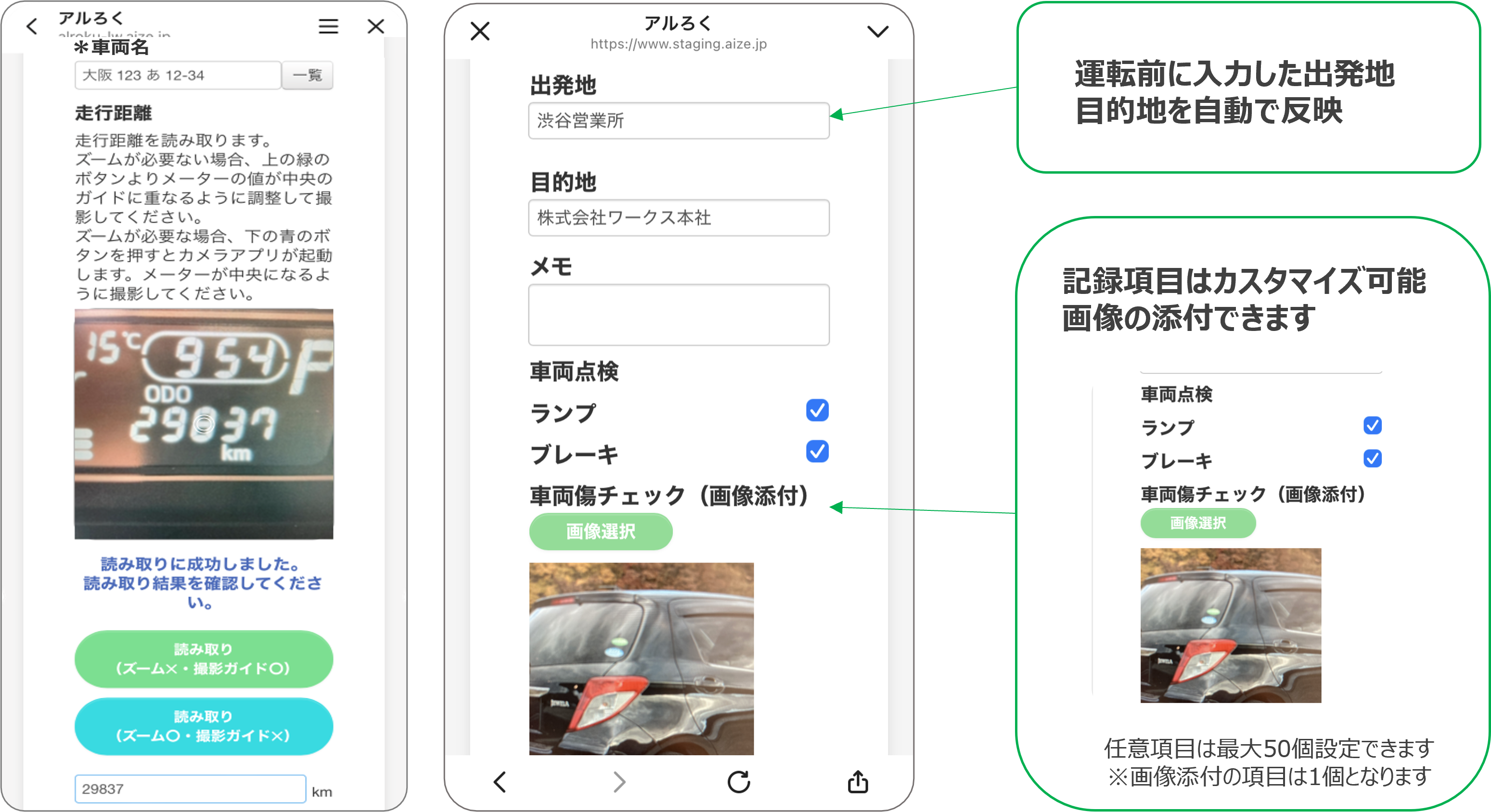 アルコールチェックだけでなく、走行距離や出発地や目的地の記録を残せるので運転日誌としても活用できます。さらにカスタマイズ機能で、同乗者や給油量、画像添付など任意で記録項目を追加できます。