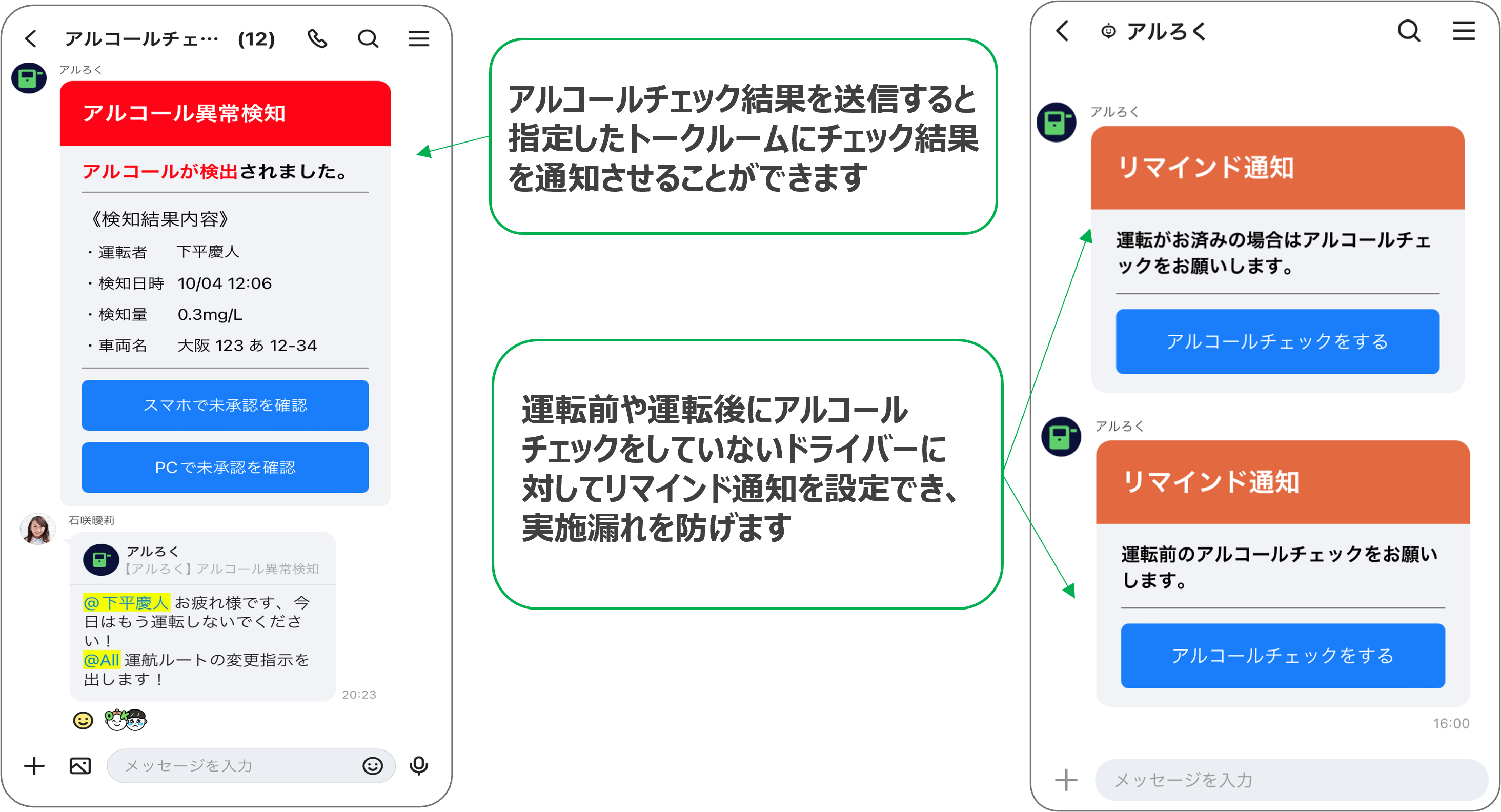 アルコールチェック結果や運転前・運転後のチェック未実施者へのアラート通知ができるので、アルコールチェックの実施漏れを防止できます。トークルーム上でドライバーへの指示や音声・ビデオ通話による運転前後の運転者の状態確認も可能です。