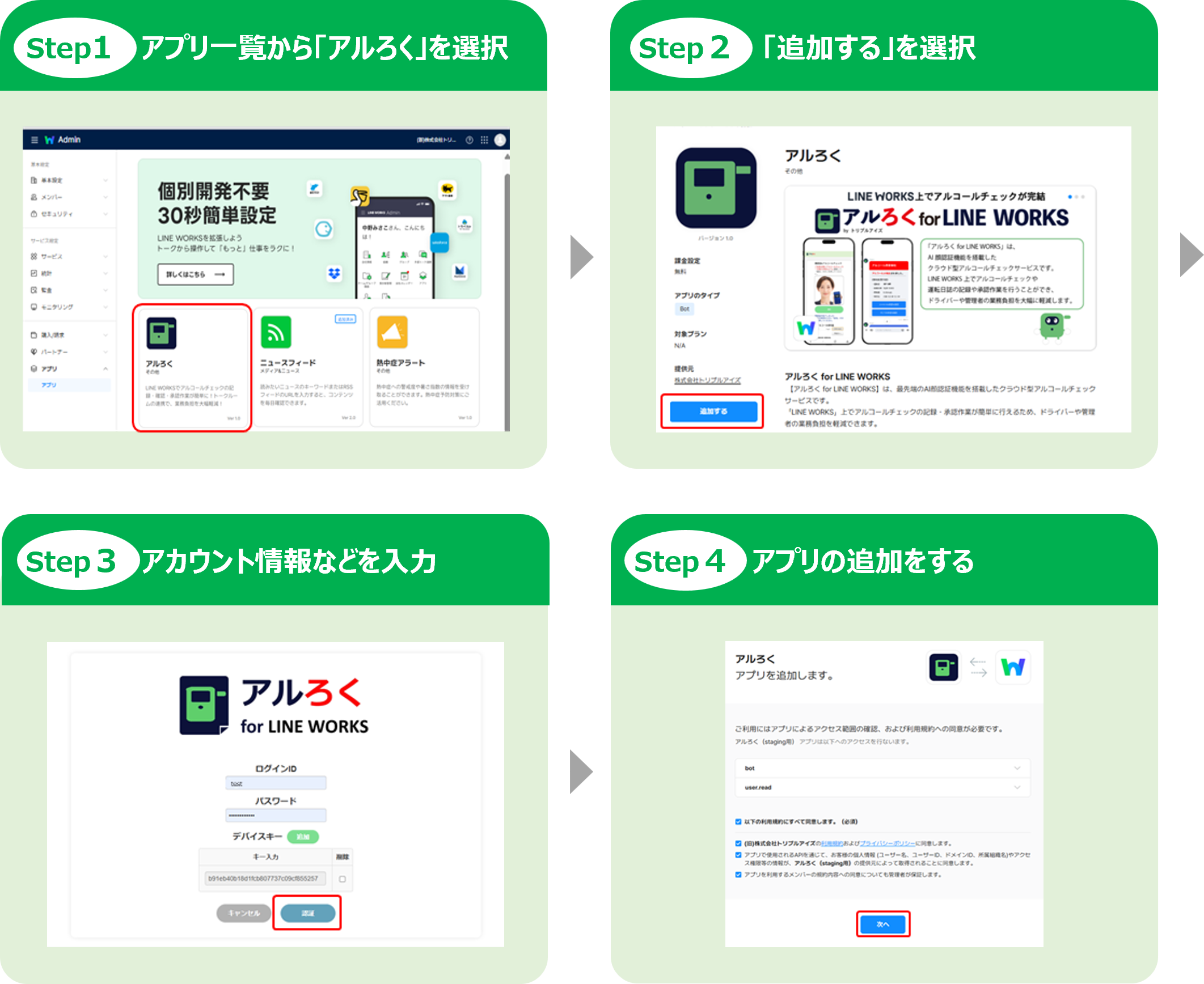 そして、ついに「アルろく for LINE WORKS」は、本日、3月17日にアプリディレクトリに掲載され、アプリの設定がより簡単になりました!LINE WORKSの管理者画面のアプリ一覧から4ステップで追加できます!