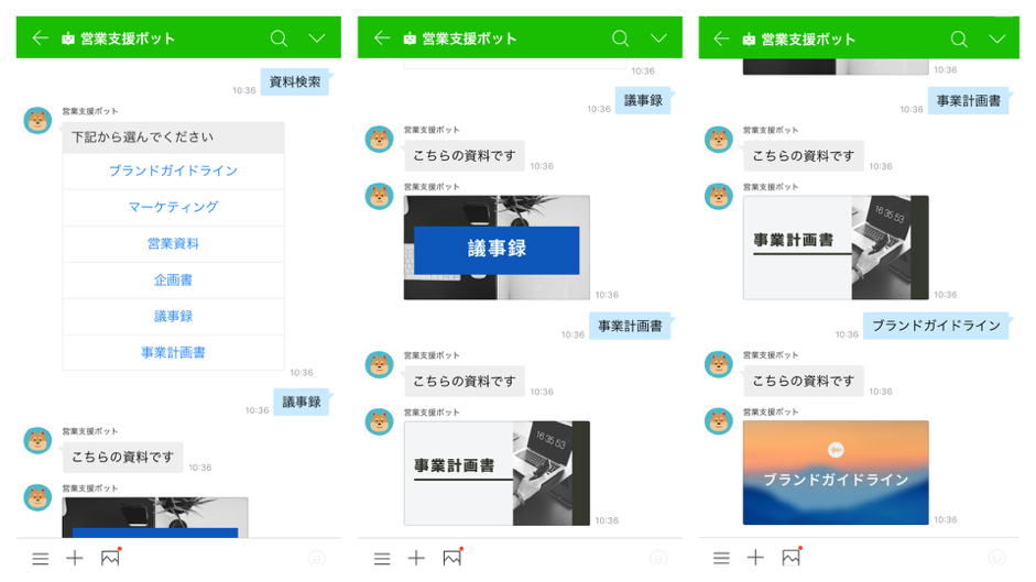 画像のBOTは簡易版なので簡単な作りになっていますが、格納されている情報量に応じて、「欲しい資料がどのフォルダ内にあるか」だけを返したり、一定階層下からはフリーワード検索にしたりすることも可能です。