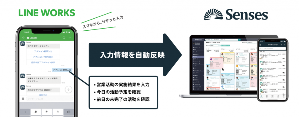 LINE WORKSに搭載されたチャットボット(hachidori)の案内に沿って営業活動情報を入力すると、内容が自動でSensesに反映されます!