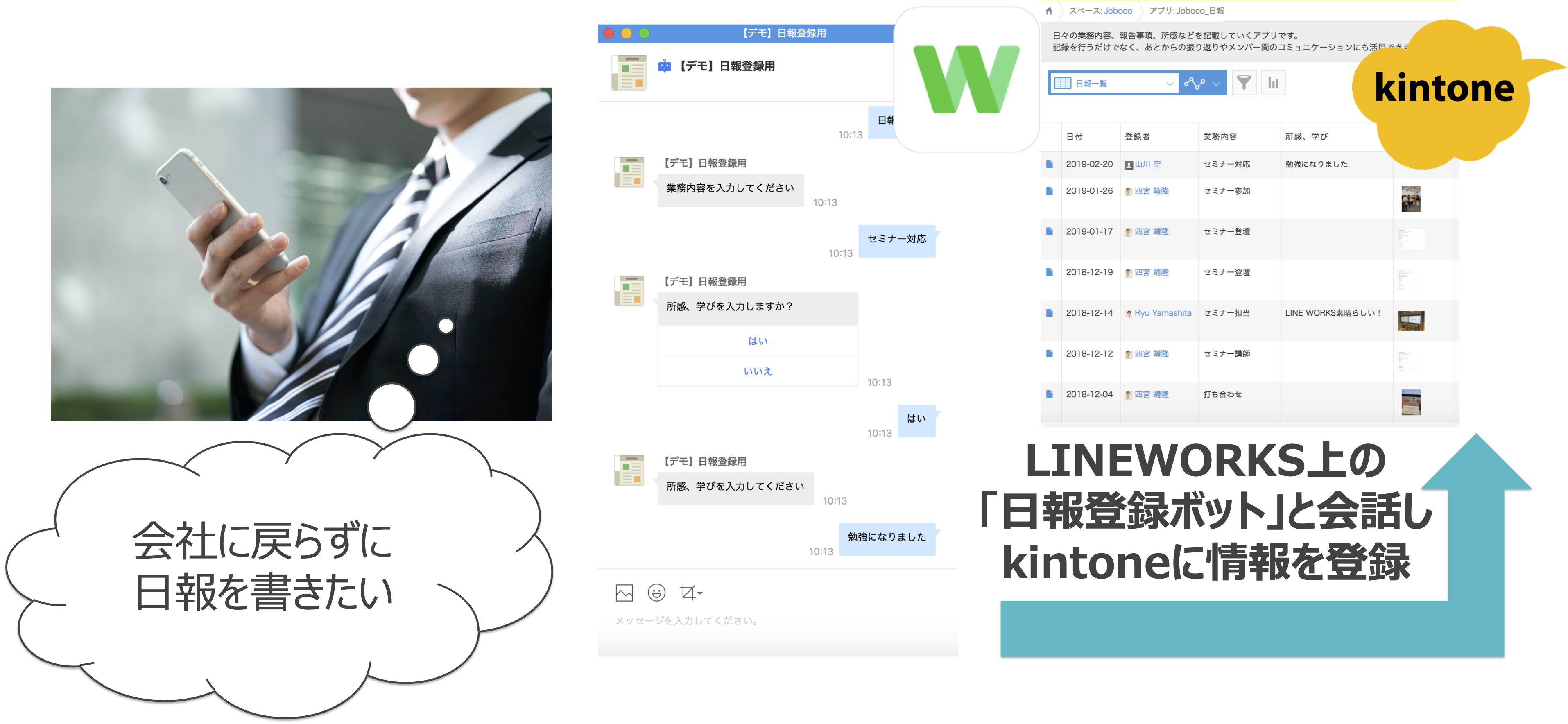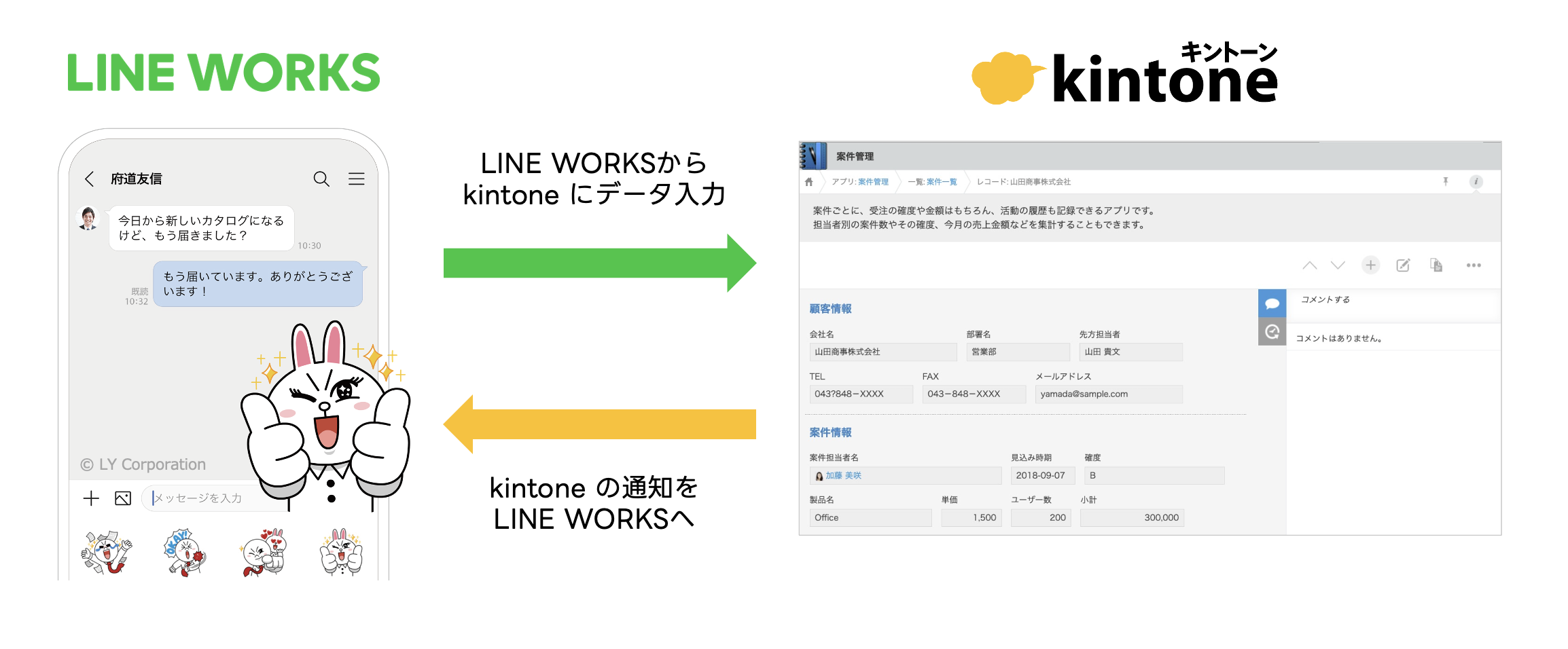 kintone を LINE WORKS と連携すると「入力」と「通知」にまつわる作業が LINE WORKS のトーク画面からもできるようになるんです!