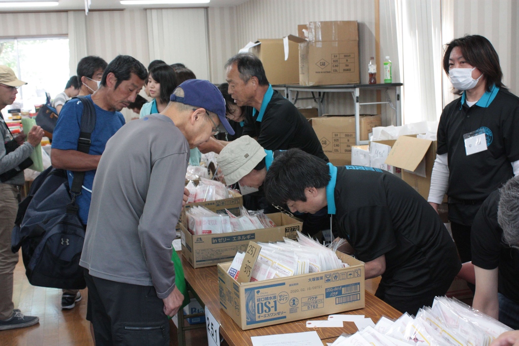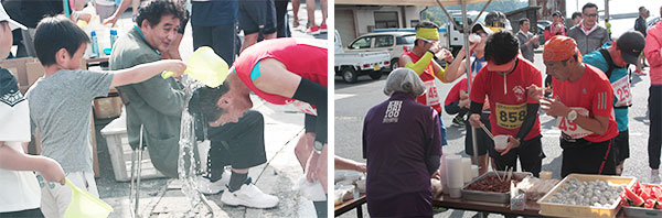 笠浦漁港すぐのところに設置されたエイドステーション。こちらでは漁港近くの方々から季節のフルーツや家庭料理が提供されました!スタート地点から近いこともあり、かなり早い時間から準備をしていただきました。