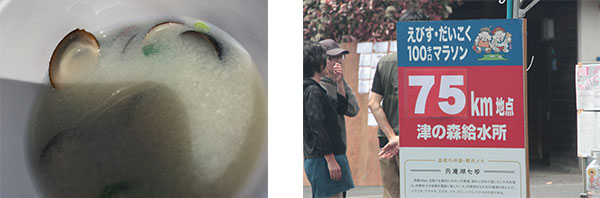△スタートから既に75kmを越え選手の方々にも疲労が見え始めたころ。適度に塩味の効いたしじみ汁が身体にしみます。