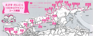 △全長約100kmのコース、美保神社から島根半島の海沿いや宍道湖沿いを抜けゴールの出雲大社を目指します。