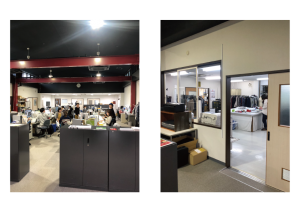社屋の内装はかなり現代風で、高い天井が開放感を感じさせる作りになっていました。社員食堂は茅葺き屋根の葺替えを最近終えられたようで、葺きたての屋根がフレッシュで心地よい香りと雰囲気が漂っていました。