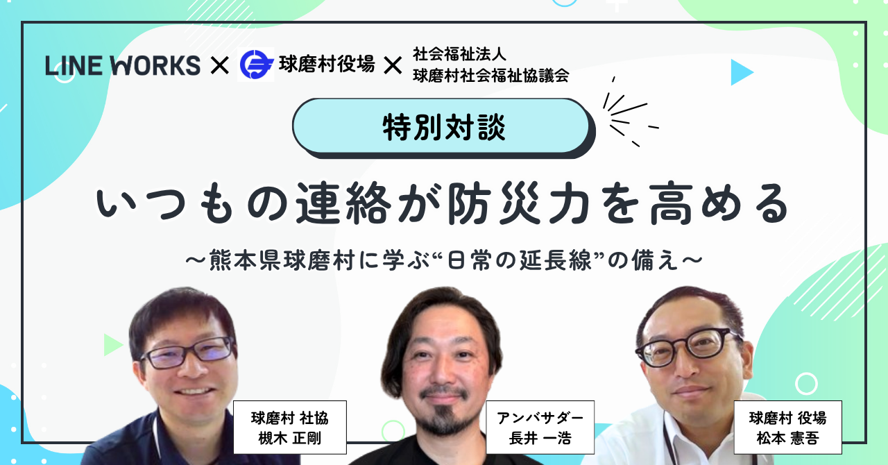 BLOG LINE WORKSチームがお届けする情報ブログです。 すべて 活用事例 連携ツール 機能紹介 イベント 会社情報 ビジネスチャット 働き方改革 Menu すべて 活用事例 連携ツール 機能紹介 イベント 会社情報 ビジネスチャット 働き方改革 %e3%83%81%e3%83%a3%e3%83%83%e3%83%88%e3%83%84%e3%83%bc%e3%83%ab チャットツール 活用事例 いつもの連絡が防災力を高める ―熊本県球磨村に学ぶ“日常の延長線”の備え 9月は防災月間。 近年は猛暑や豪雨などの異常気象で全国各地に大規模災害が発生しています。防災は特別な準備ではなく、日常の習慣や人とのつながりがそのまま非常時の力 2025.09.30 ビジネスチャット 働き方改革 管理者の方必見!LINE WORKSよくあるお悩み対処法 チーム内での活用が広がらない… 運営上のハラスメントやセキュリティ対策が心配になってきた… 今回はそんなLINE WORKSを開設し 2025.06.16 活用事例 機能紹介 店舗の在庫状況が不透明で悩んでいます(お悩み相談室#9) こんにちは! 【仕事のお悩み相談室】のコーナーです。 このコーナーでは、はたらく人が直面するさまざまなお悩みを募集して、それを解決できそうなアイデ 2025.04.09 活用事例 連携ツール ビジネスチャット 働き方改革 紙の使用量40%削減と情報共有の速度アップを、まとめて実現するツール! DXの本当の成果は、効率化アップによる社員の負担軽減 2022.12.21 もっと見る 4 4