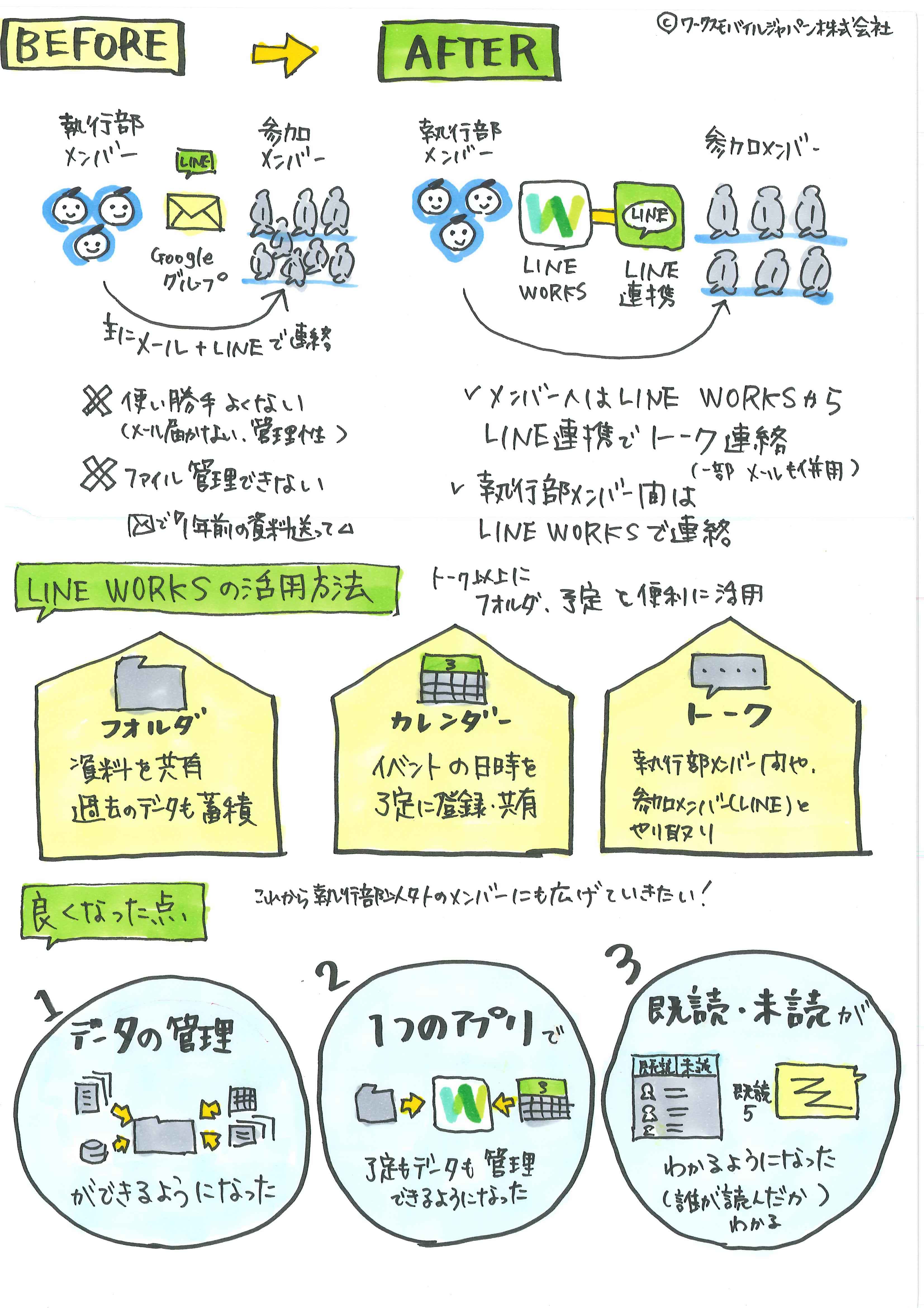 使い始めたきっかけや、なぜLINE WORKSなのか、どんな風に使っていらっしゃるのかについて、グラレコ(グラフィックレコーディング=話の内容を絵や図などのグラフィックにして記録する方法)風にまとめてみました。