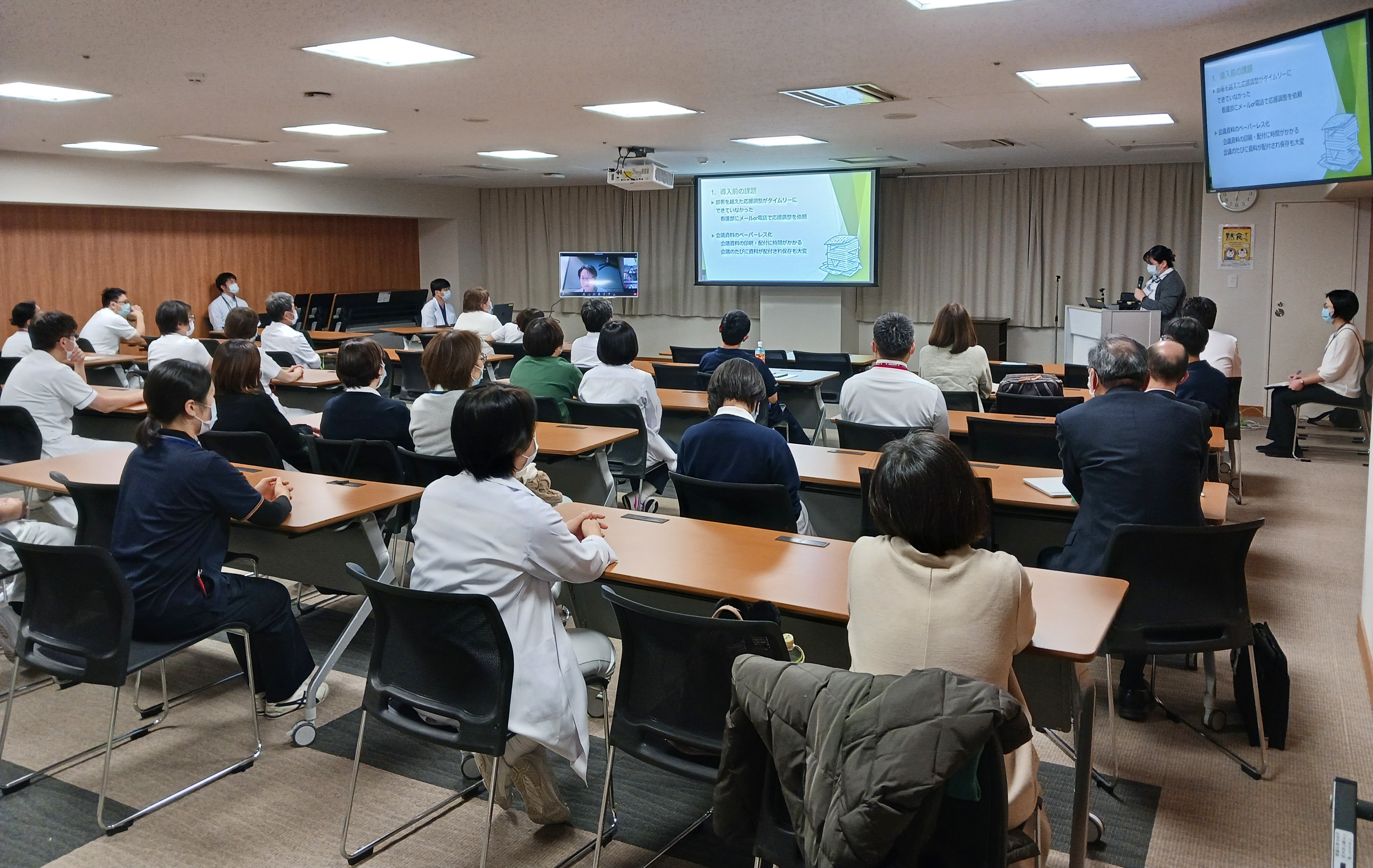 本報告会は、院内での具体的な活用方法や運用上の工夫を共有し、各部署の業務改善につなげることを目的に、3部署からの事例発表が行われました。