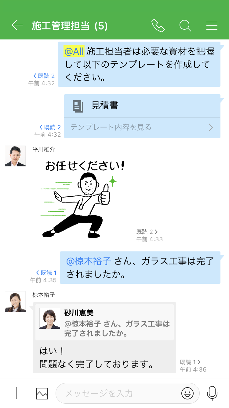 また、業者が不要な見積もりを追加しないよう、同じ LINE WORKS グループに招待してやり取りすることで透明性を担保できます。