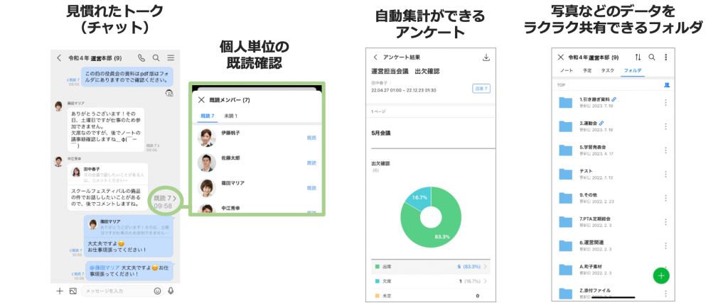 ・アンケートも使えるから、回答集計が簡単です。運営マニュアルや各種資料を保存できるフォルダもあります。