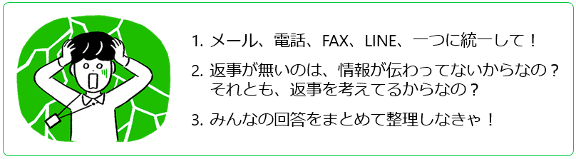 お祭りや運動会、地域振興の催し、展示会、ビジネス交流会と世の中にはさまざまなイベントがあります。イベント運営事務局の方が抱えている共通の悩み、それは、非効率なコミュニケーション!