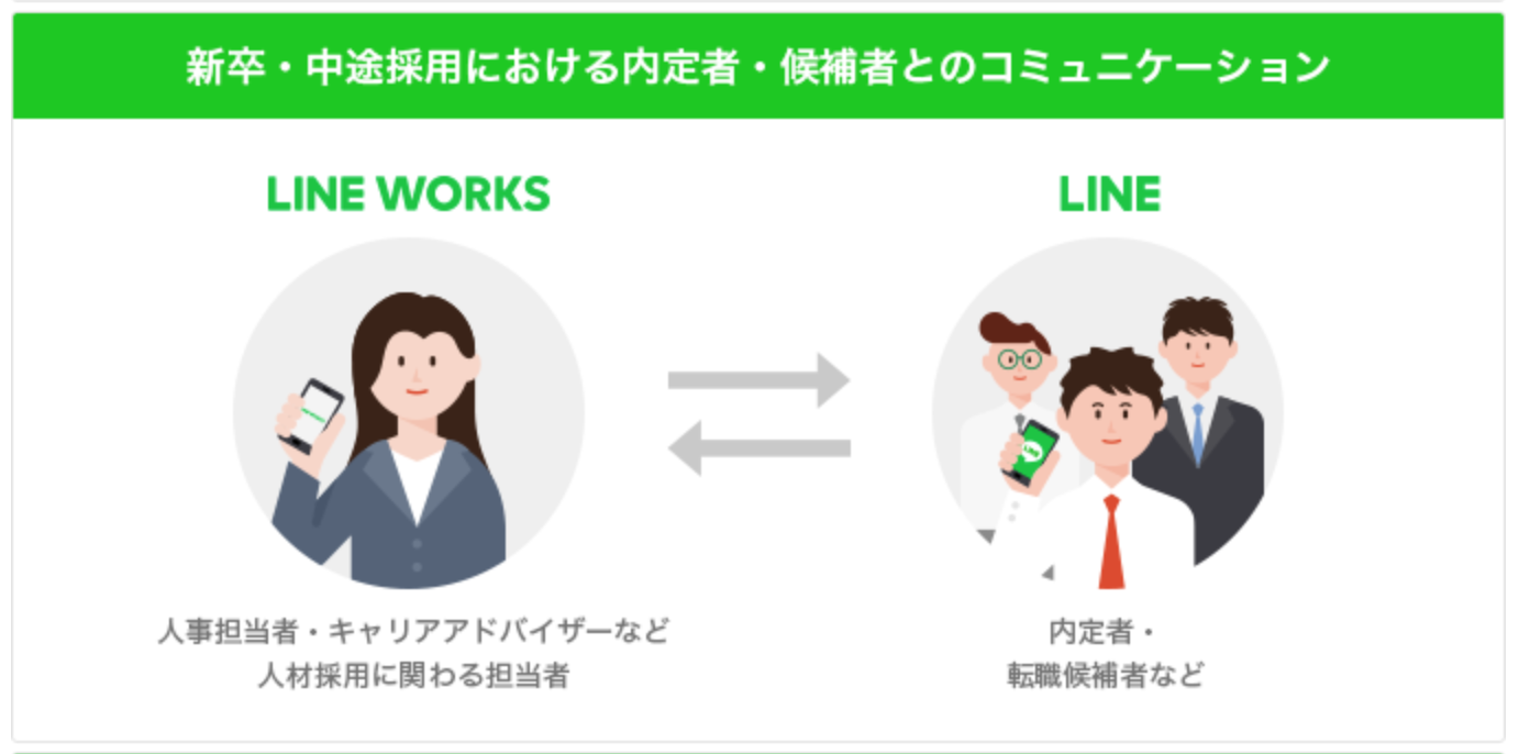 売り手市場で人材確保の難しい最近ですが、新卒採用では、最近の学生がメールや電話だとなかなか連絡がつかず、事務連絡や内定後のフォローが行き届かないという状況が起きがち。また中途採用でも、現職にある候補者とは日中の連絡が滞りがちで、なかなか転職活動が進まないということが起きます。新卒採用においては、若い世代に親しみのあるLINEと企業の人事担当チームがつながることで、こまめなフォローを行い、入社志望度を上げ内定辞退を防ぐことができます。また、中途採用において、転職エージェントや企業の人事担当チームが候補者とつながることで、連絡が円滑になり、候補者にとっても負担のない転職活動ができるようになります。