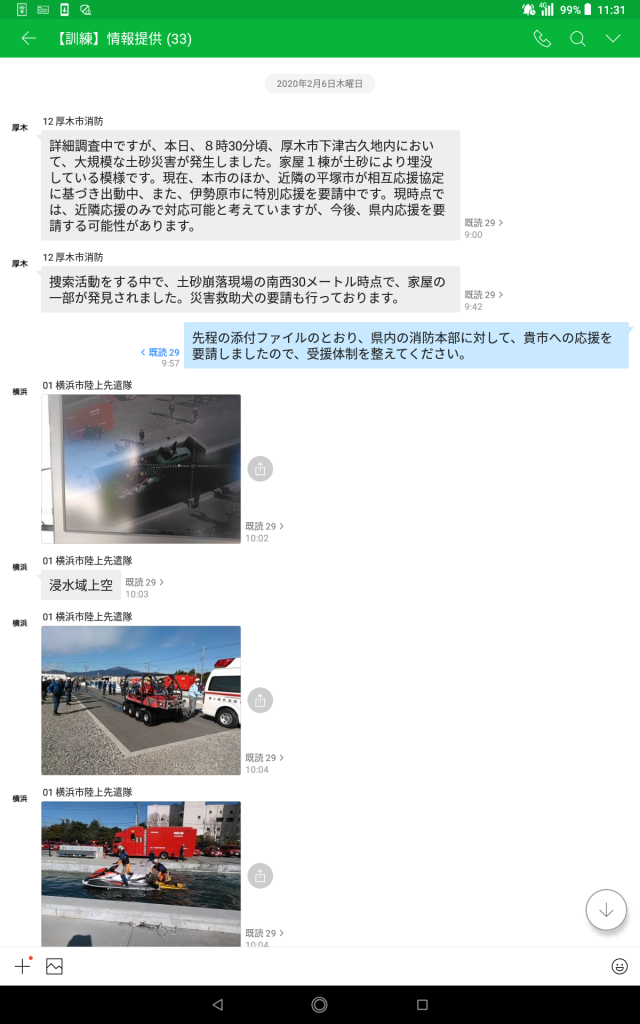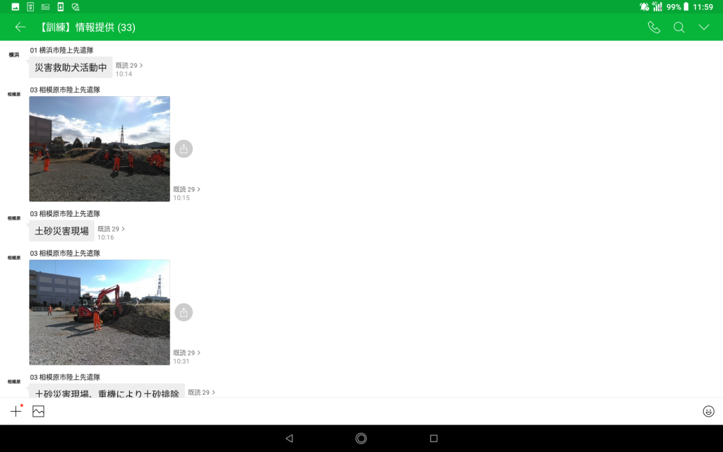 土砂災害訓練でのLINE WORKSでのトークでは、現場の写真、テキストでの状況報告などが送信されていました。緊急時も、同じ情報をすぐに関係者全員が確認することができます。
