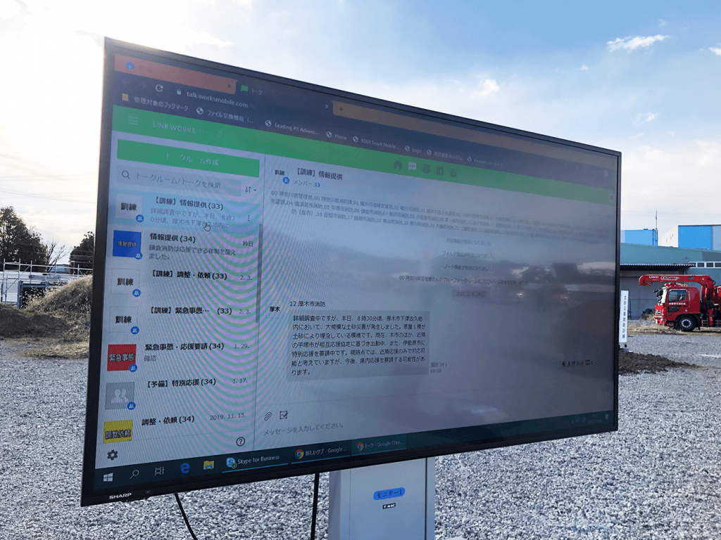 LINE WORKSのトーク画面が大きなスクリーンに映し出されていました。今回の消防訓練では、県と各消防本部の情報共有にLINE WORKSが使われています。