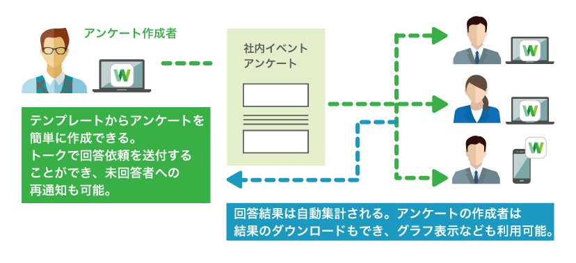 LINE WORKSのアンケート機能を利用すると、社内メンバーからの情報収集業務を効率化したり、メンバーの意見や考えを手間なく集めたりすることができます。さらに集めた情報は自動で集計されるので、集計作業や報告の手間も軽減することができます。