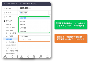 LINE WORKSの管理者には、複数の役割があるとご存知でしたか?最高管理者は管理者画面の全メニューにアクセスでき、1つのワークスグループにつき1人のみです。しかし、特定のメニューにアクセスが可能な副管理者や運用担当者の権限は任意のメンバーに付与することができます。