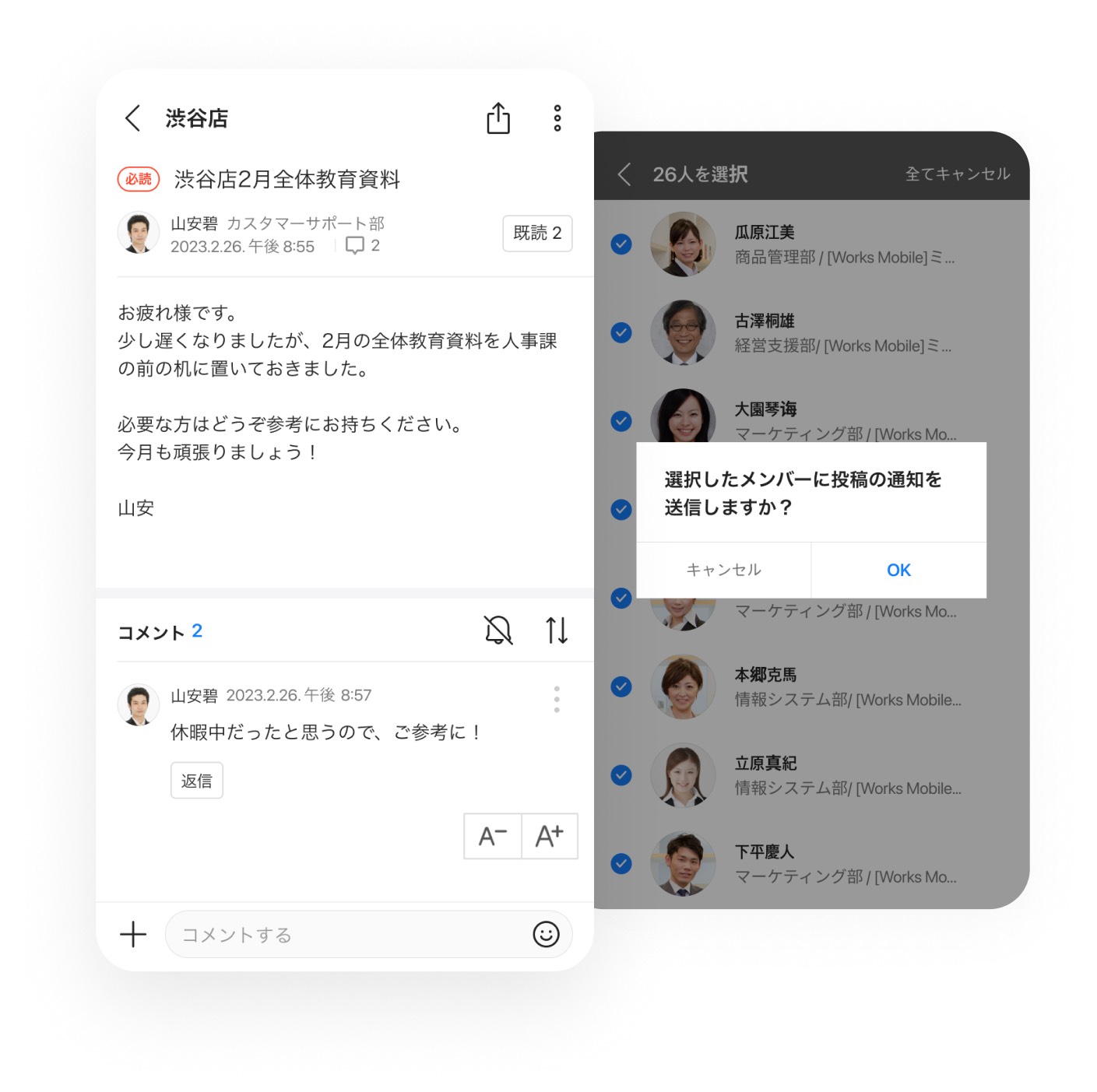 LINE WORKSの「掲示板」機能を使えば、投稿があった際に新着通知でお知らせが届きます。投稿者や管理者は、投稿ごとに誰が閲覧したか既読/未読の確認ができます。重要なお知らせは必読設定をしたり、未読者への再通知も可能です。もちろん出先からも確認ができるので、わざわざ帰社する必要がなくなり移動時間を削減できるでしょう。