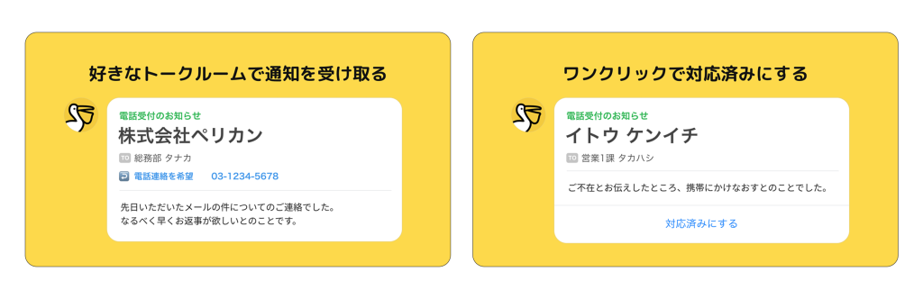 fondeskと連携すると、会社や事務所の電話対応をオペレーターが代行し、内容を指定のトークルームに自動配信してくれます。