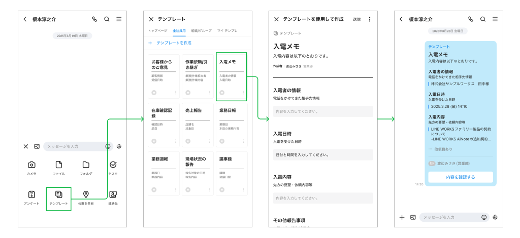 トーク画面の「テンプレート」アイコンを押して「入電メモ」のテンプレートを選択、情報を入力して送信するだけでタイムリーな情報共有が可能です。