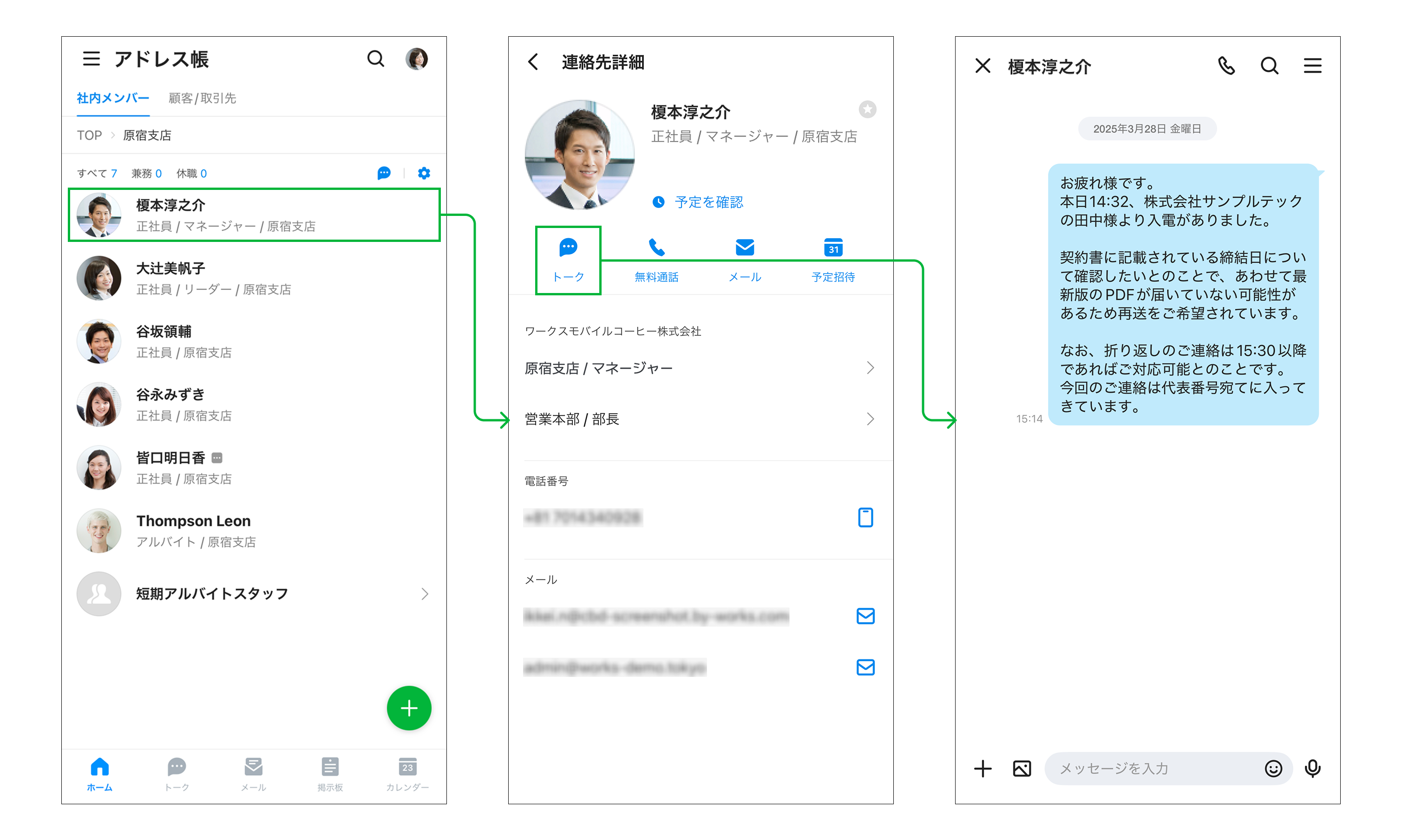 アドレス帳の連絡先詳細からそのままトーク画面に遷移できるので、即座にメッセージを送れます。