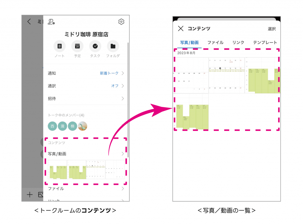 書き換えた後の写真をトークルームに送信すれば、トークルームの “コンテンツ” からいつでも簡単に最新状態を確認できます。