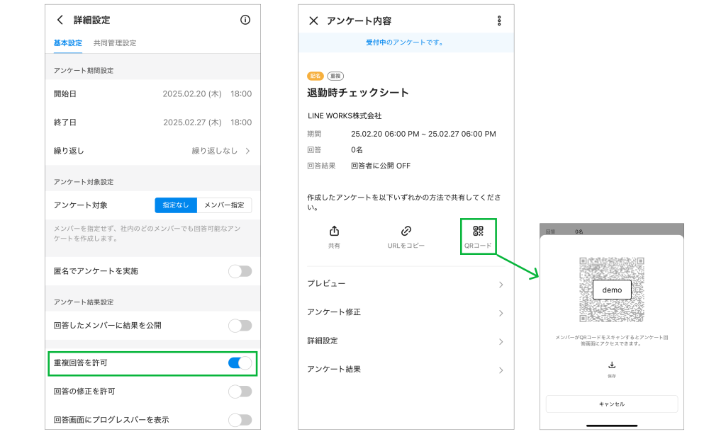 アンケートの詳細画面からQRコードを発行、オフィスの出口付近に設置しましょう。