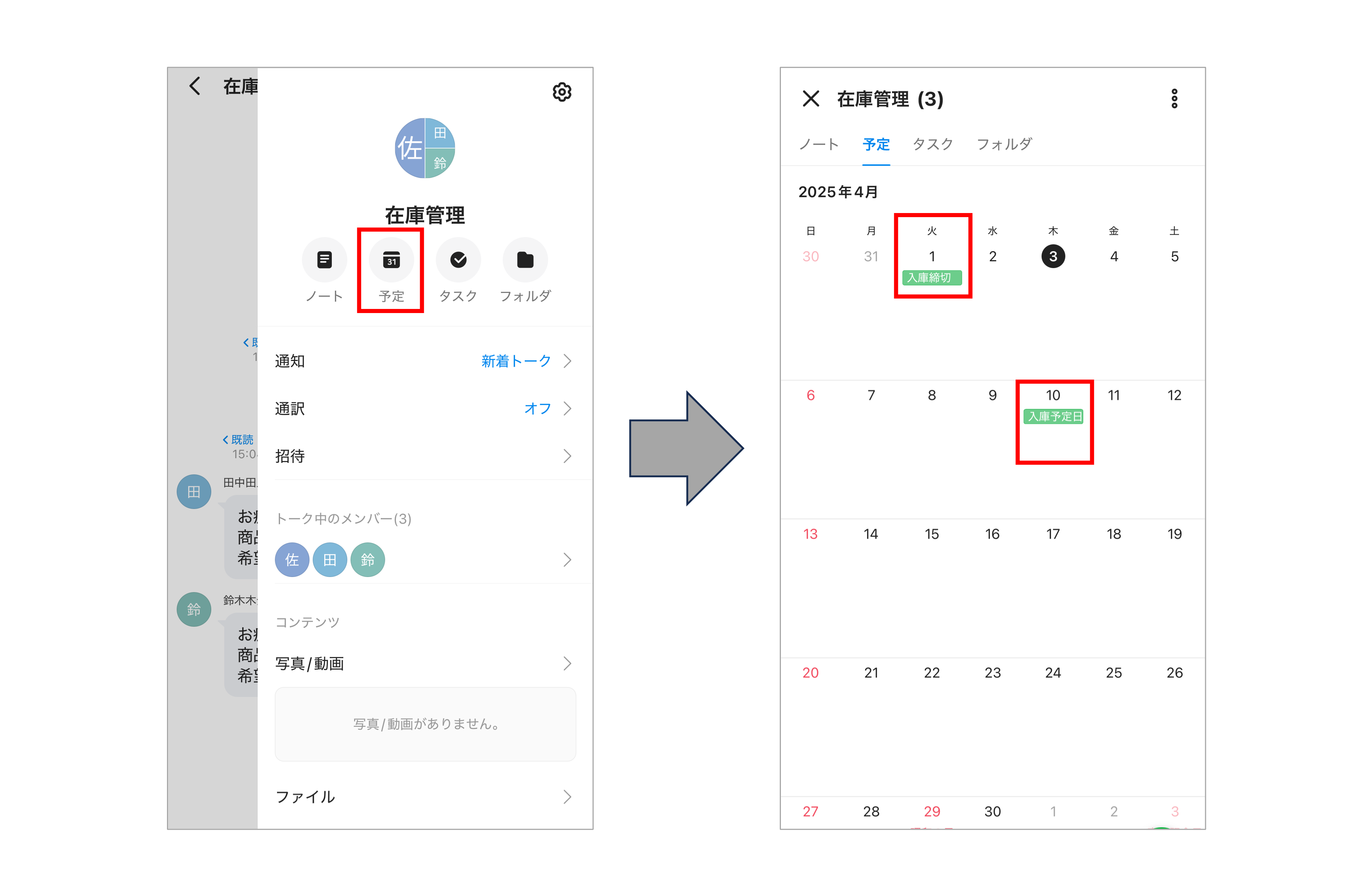グループトークルームの「予定機能」を活用すれば、商品の入庫予定日の共有や発注数の管理が簡単になります。