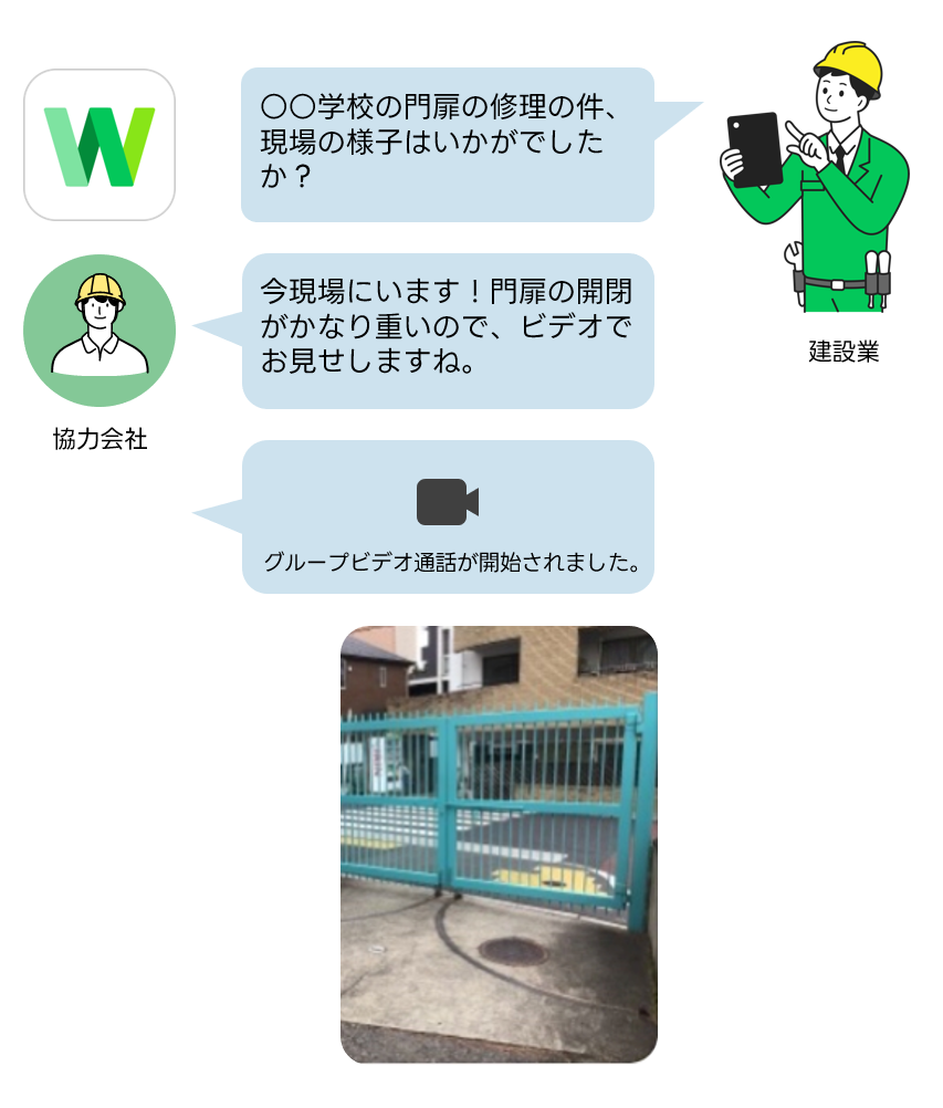LINE WORKS同士ならビデオ通話も使えるため、写真だけでは伝わらない現場の情報もリアルタイムに共有することができます。