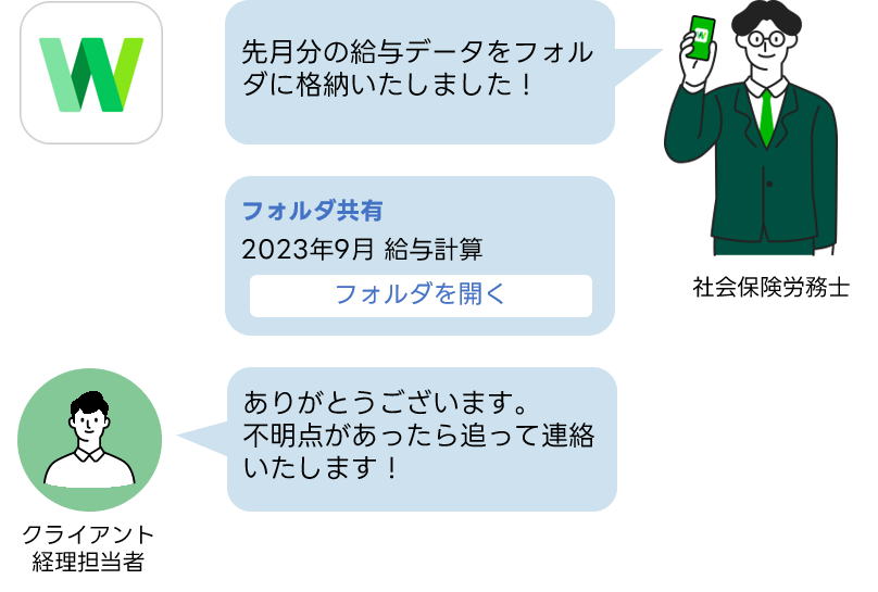 社会保険労務士法人では、クライアントとつながることで手続きに必要なデータのやり取りをトークだけで完結しています。