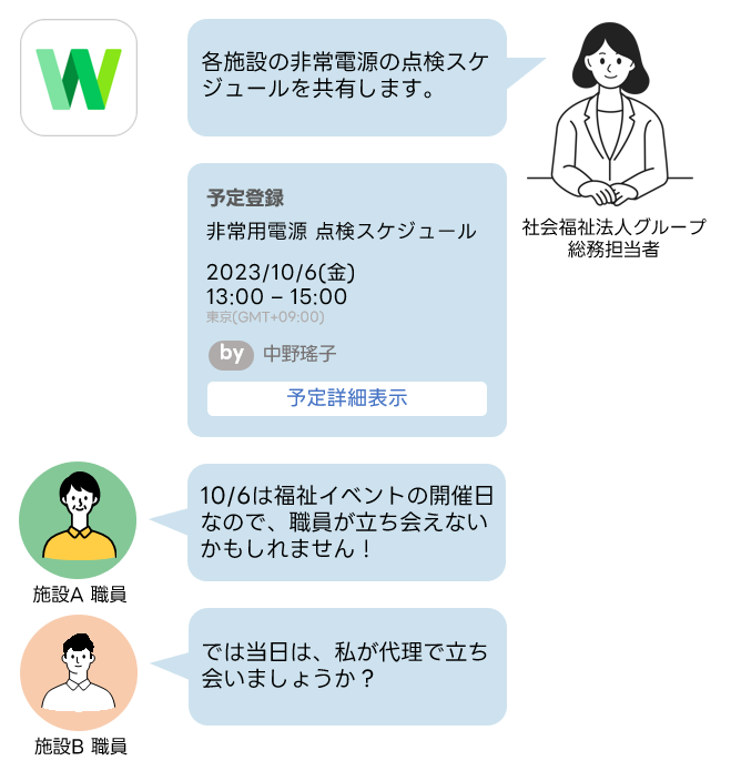 離れた拠点の施設同士でも予定の共有や事務連絡がスムーズに行え、スマホだけで対応できるのでデスクに座っている時間が少ない職員にも最適です。