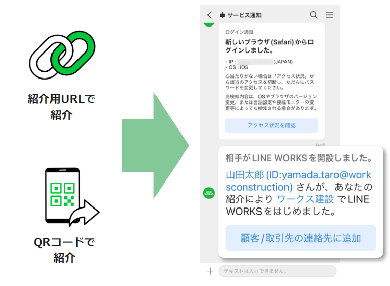 紹介用のURLとQRコードを使えば、紹介した相手が開設した際に通知が届くのでスムーズにトークを開始することができます。相手がLINE WORKSを新たに開設すると、お互いに共有ストレージ0.5GBがプレゼントされるメリットもありますよ。