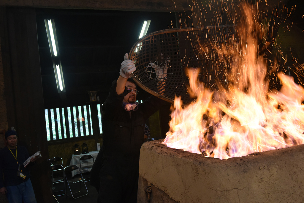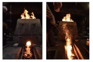 燃料となる木炭を炉にくべ、炉の温度をおよそ1300℃まで上げていきます、物凄い火力です。